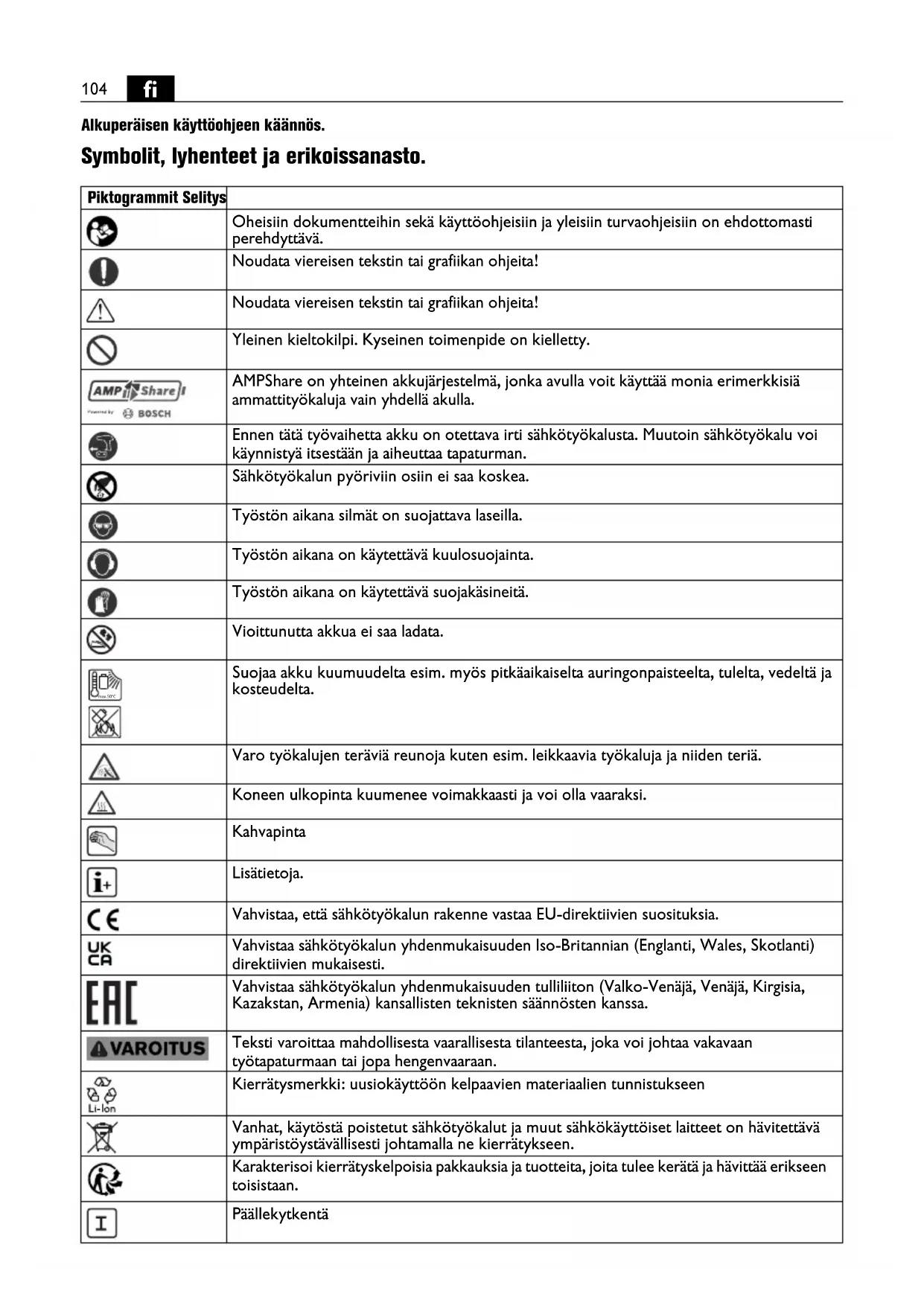 Alkuperäisen käyttöohjeen käännös. Symbolit, lyhenteet ja erikoissanasto. Piktogrammit Selitys Oheisiin dokumentteihin sekä käyttöohjeisiin ja yleisiin turvaohjeisiin on ehdottomasti perehdyttävä. Noudata viereisen tekstin tai grafiikan ohjeita! Noudata viereisen tekstin tai grafiikan ohjeita! Yleinen kieltokilpi. Kyseinen toimenpide on kielletty. AMPShare on yhteinen akkujärjestelmä, jonka avulla voit käyttää monia erimerkkisiä ammattityökaluja vain yhdellä akulla. Ennen tätä työvaihetta akku on otettava irti sähkötyökalusta. Muutoin sähkötyökalu voi käynnistyä itsestään ja aiheuttaa tapaturman. Sähkötyökalun pyöriviin osiin ei saa koskea. Työstön aikana silmät on suojattava laseilla. Työstön aikana on käytettävä kuulosuojainta. Työstön aikana on käytettävä suojakäsineitä. Vioittunutta akkua ei saa ladata. Suojaa akku kuumuudelta esim. myös pitkäaikaiselta auringonpaisteelta, tulelta, vedeltä ja kosteudelta. Varo työkalujen teräviä reunoja kuten esim. leikkaavia työkaluja ja niiden teriä. Koneen ulkopinta kuumenee voimakkaasti ja voi olla vaaraksi. Kahvapinta Lisätietoja. Vahvistaa, että sähkötyökalun rakenne vastaa EU-direktiivien suosituksia. Vahvistaa sähkötyökalun yhdenmukaisuuden Iso-Britannian (Englanti, Wales, Skotlanti) direktiivien mukaisesti. Vahvistaa sähkötyökalun yhdenmukaisuuden tulliliiton (Valko-Venäjä, Venäjä, Kirgisia, Kazakstan, Armenia) kansallisten teknisten säännösten kanssa. Teksti varoittaa mahdollisesta vaarallisesta tilanteesta, joka voi johtaa vakavaan työtapaturmaan tai jopa hengenvaaraan. Kierrätysmerkki: uusiokäyttöön kelpaavien materiaalien tunnistukseen Vanhat, käytöstä poistetut sähkötyökalut ja muut sähkökäyttöiset laitteet on hävitettävä ympäristöystävällisesti johtamalla ne kierrätykseen. Karakterisoi kierrätyskelpoisia pakkauksia ja tuotteita, joita tulee kerätä ja hävittää erikseen toisistaan. Päällekytkentä max.50°C105