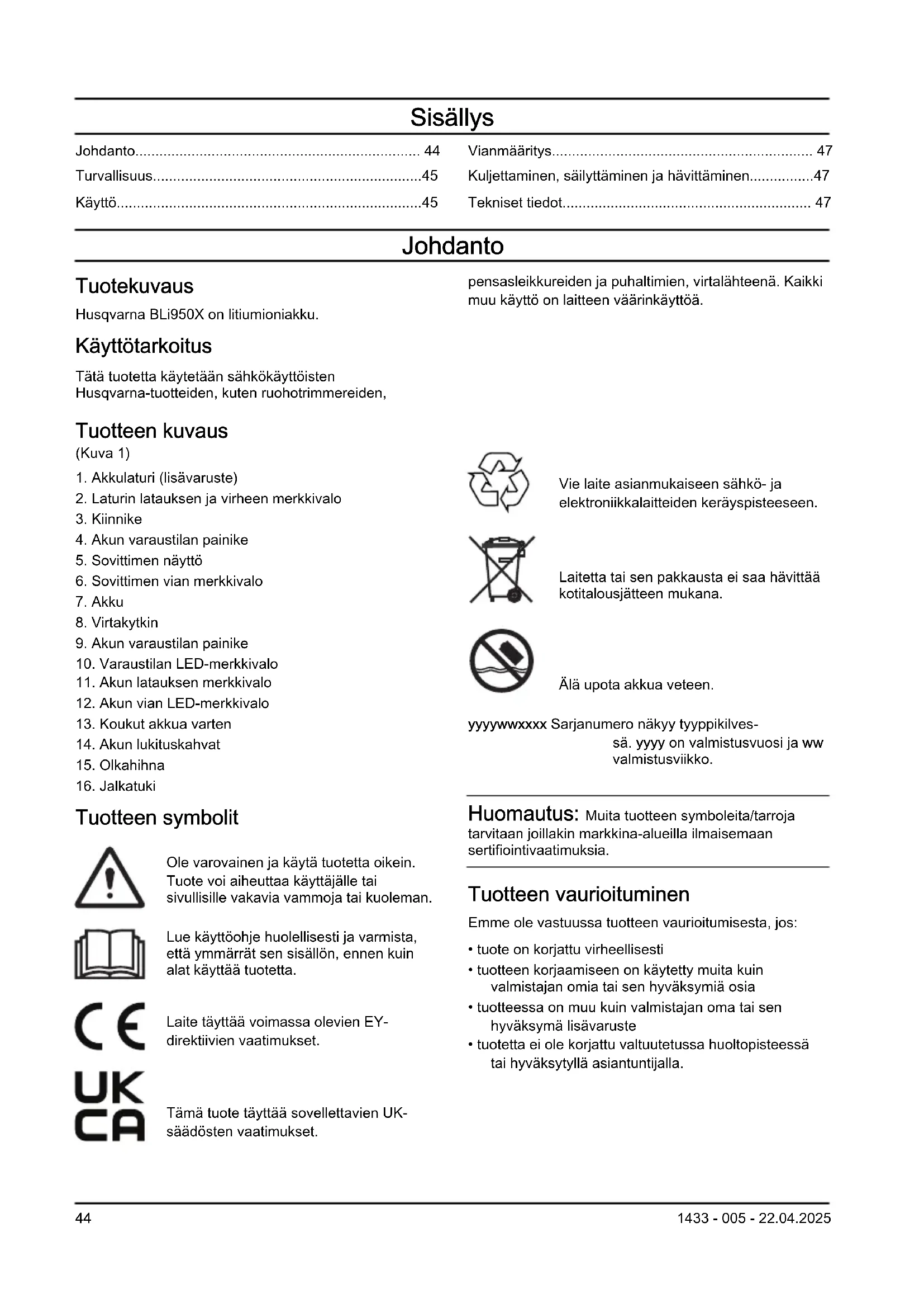 - Puhastage akut enne hoiulepanekut. Aku, akulaadija ja seadme kasutuselt kõrvaldamine Allolev sümbol tähendab, et seade ei kuulu olmejäätmete hulka. Toimetage see elektri- ja elektroonikajäätmete vastuvõtupunkti. Nii aitate vältida keskkonna ja inimeste kahjustamist. Lisateavet küsige kohalikelt ametkondadelt, olmejäätmete käitlejatelt või edasimüüjalt. Märkus: Sümbol asub tootel või toote pakendil. Tehnilised andmed Tehnilised andmed leiate aku tüübisildilt. 42 1433 - 005 - 22.04.2025Heakskiidetud akulaadijad Akulaadija 40-C750X Sisendpinge, V 100-240 Sagedus, Hz 50-60 Võimsus, W 750 1433 - 005 - 22.04.2025 43Sisällys Johdanto....................................................................... 44 Turvallisuus...................................................................45 Käyttö............................................................................45 Vianmääritys................................................................. 47 Kuljettaminen, säilyttäminen ja hävittäminen................47 Tekniset tiedot.............................................................. 47 Johdanto Tuotekuvaus Husqvarna BLi950X on litiumioniakku. Käyttötarkoitus Tätä tuotetta käytetään sähkökäyttöisten Husqvarna-tuotteiden, kuten ruohotrimmereiden, pensasleikkureiden ja puhaltimien, virtalähteenä. Kaikki muu käyttö on laitteen väärinkäyttöä. Tuotteen kuvaus (Kuva 1)