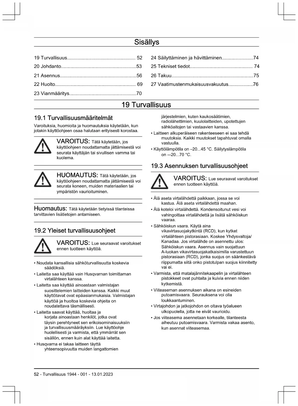- Turvallisuus 1944 - 001 - 13.01.202319.4 Huollon turvallisuusohjeet VAROITUS: Lue seuraavat varoitukset ennen tuotteen käyttöä.
