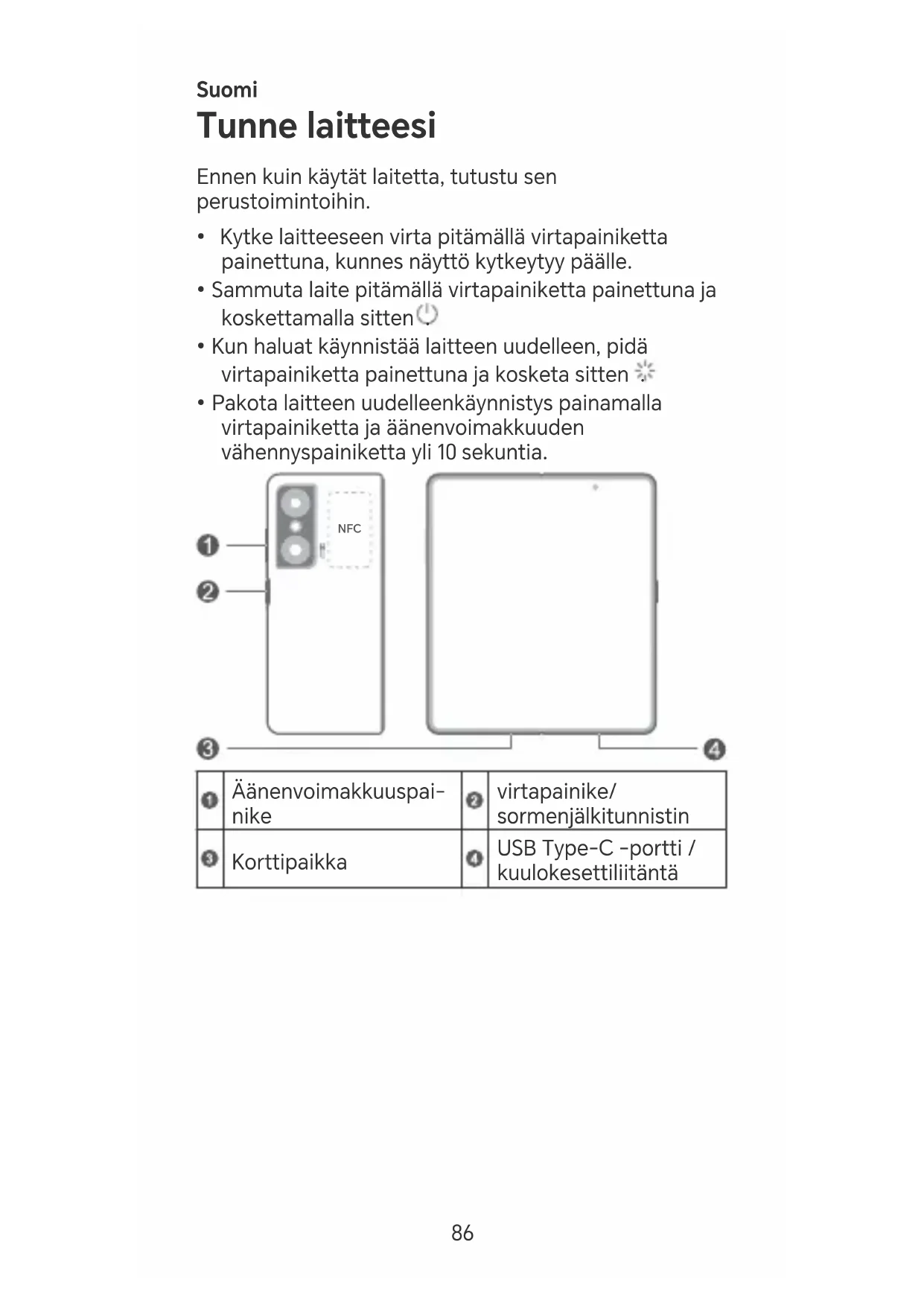 Äänenvoimakkuuspai- nike viapainike/ sormenjälkitunnistin Kotipaikka USB Type-C -poti / kuulokesettiliitäntä 86• Pidä NFC-alue lähellä muita laitteita tai kohteita, kun käytät NFC-toimintoa.