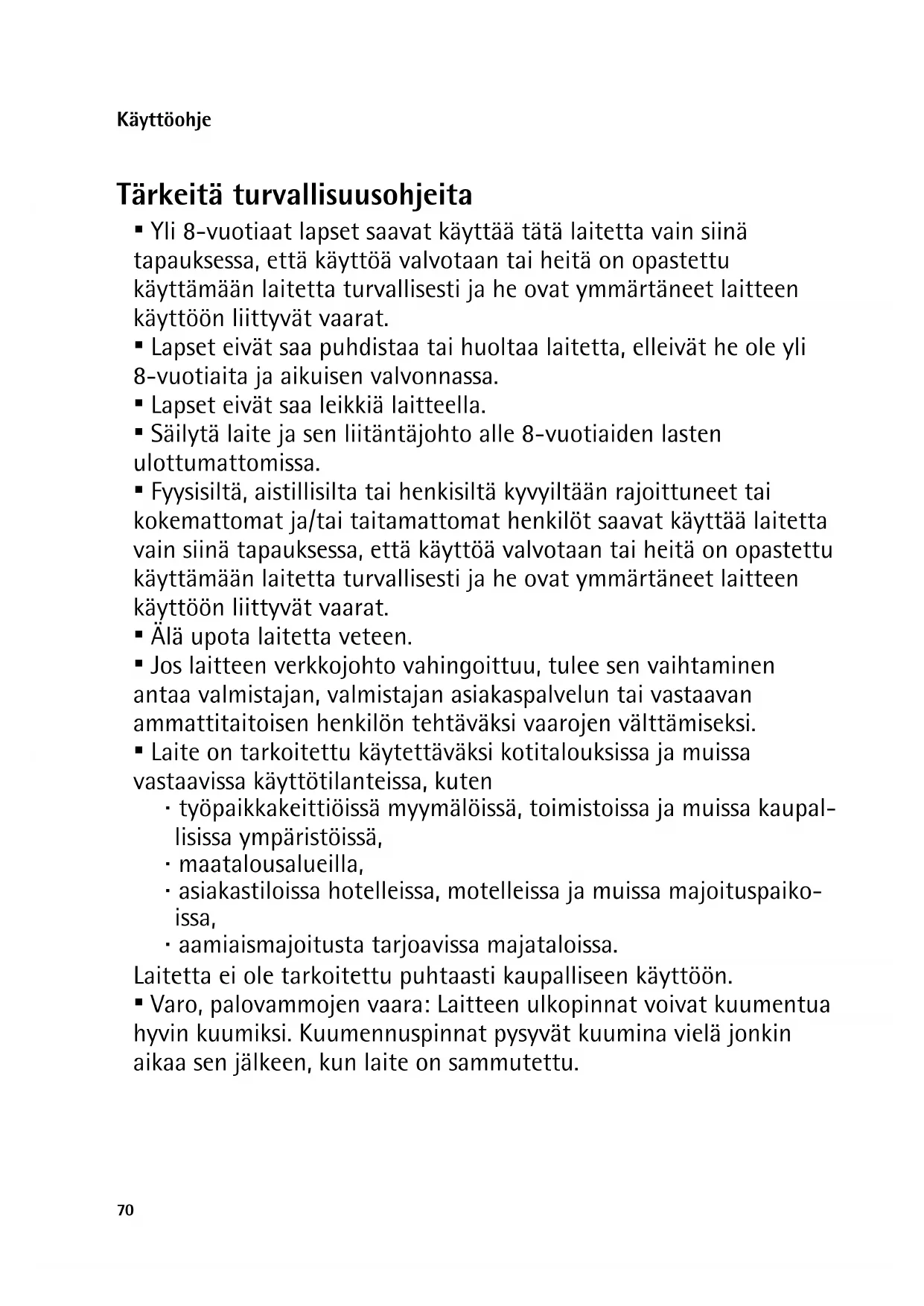 - Varo, palovammojen vaara: Laitteen ulkopinnat voivat kuumentua hyvin kuumiksi. Kuumennuspinnat pysyvät kuumina vielä jonkin aikaa sen jälkeen, kun laite on sammutettu.71