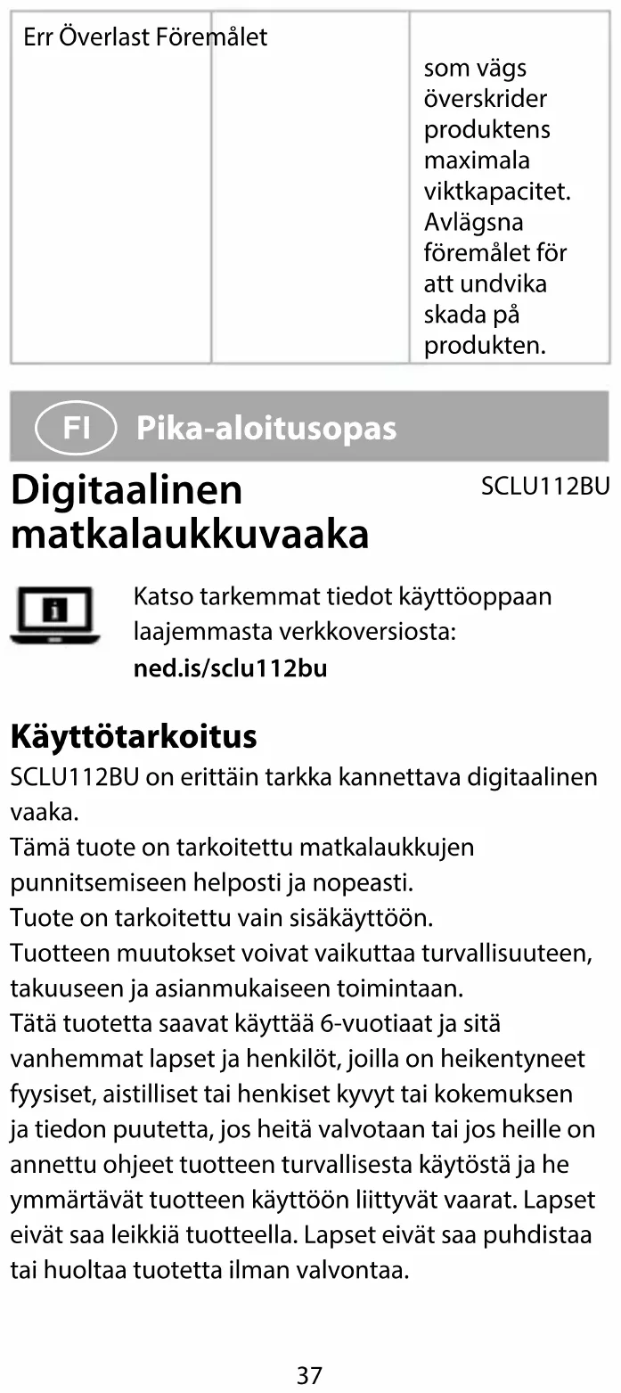 Pika-aloitusopas Digitaalinen matkalaukkuvaaka SCLU112BU Katso tarkemmat tiedot käyttöoppaan laajemmasta verkkoversiosta: ned.is/sclu112bu Käyttötarkoitus SCLU112BU on erittäin tarkka kannettava digitaalinen vaaka. Tämä tuote on tarkoitettu matkalaukkujen punnitsemiseen helposti ja nopeasti. Tuote on tarkoitettu vain sisäkäyttöön. Tuotteen muutokset voivat vaikuttaa turvallisuuteen, takuuseen ja asianmukaiseen toimintaan. Tätä tuotetta saavat käyttää 6-vuotiaat ja sitä vanhemmat lapset ja henkilöt, joilla on heikentyneet fyysiset, aistilliset tai henkiset kyvyt tai kokemuksen ja tiedon puutetta, jos heitä valvotaan tai jos heille on annettu ohjeet tuotteen turvallisesta käytöstä ja he ymmärtävät tuotteen käyttöön liittyvät vaarat. Lapset eivät saa leikkiä tuotteella. Lapset eivät saa puhdistaa tai huoltaa tuotetta ilman valvontaa.38 Tärkeimmät osat (kuva A) 1 Näyttö 2 Kolmiorengas 3 Virta- ja Z/T-painike (nollaus/taaraus) 4 Mittayksikköpainike 5 Hihna 6 Koukku 7 Akku 8 Paristolokero 9 Paristolokeron kansi Turvallisuusohjeet