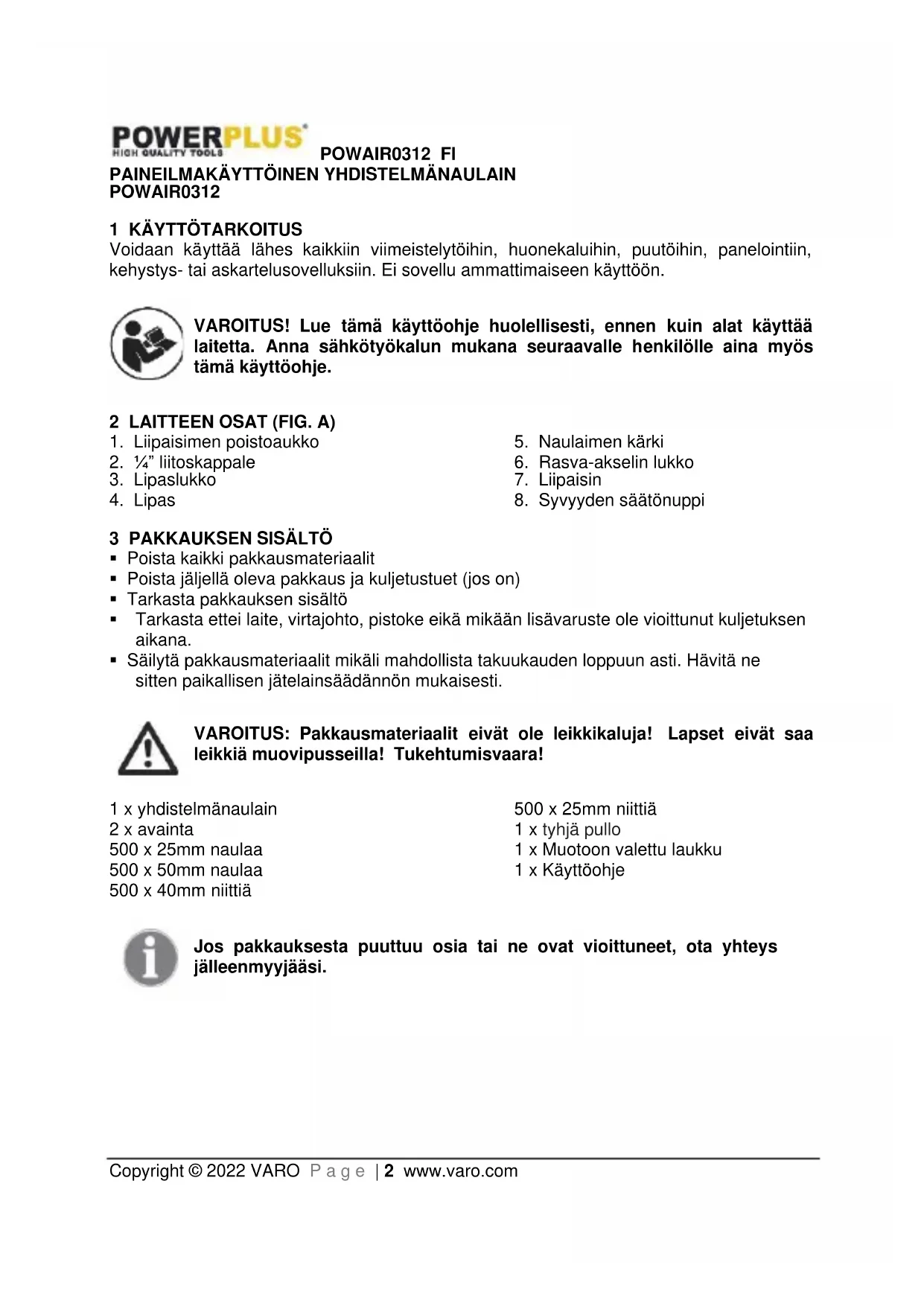 ollessa kiinnittimen ohjaimen päällä. Älä lataa liipaisimen ollessa painettu.POWAIR0312 FI Copyright © 2022 VARO P a g e | 7 www.varo.com