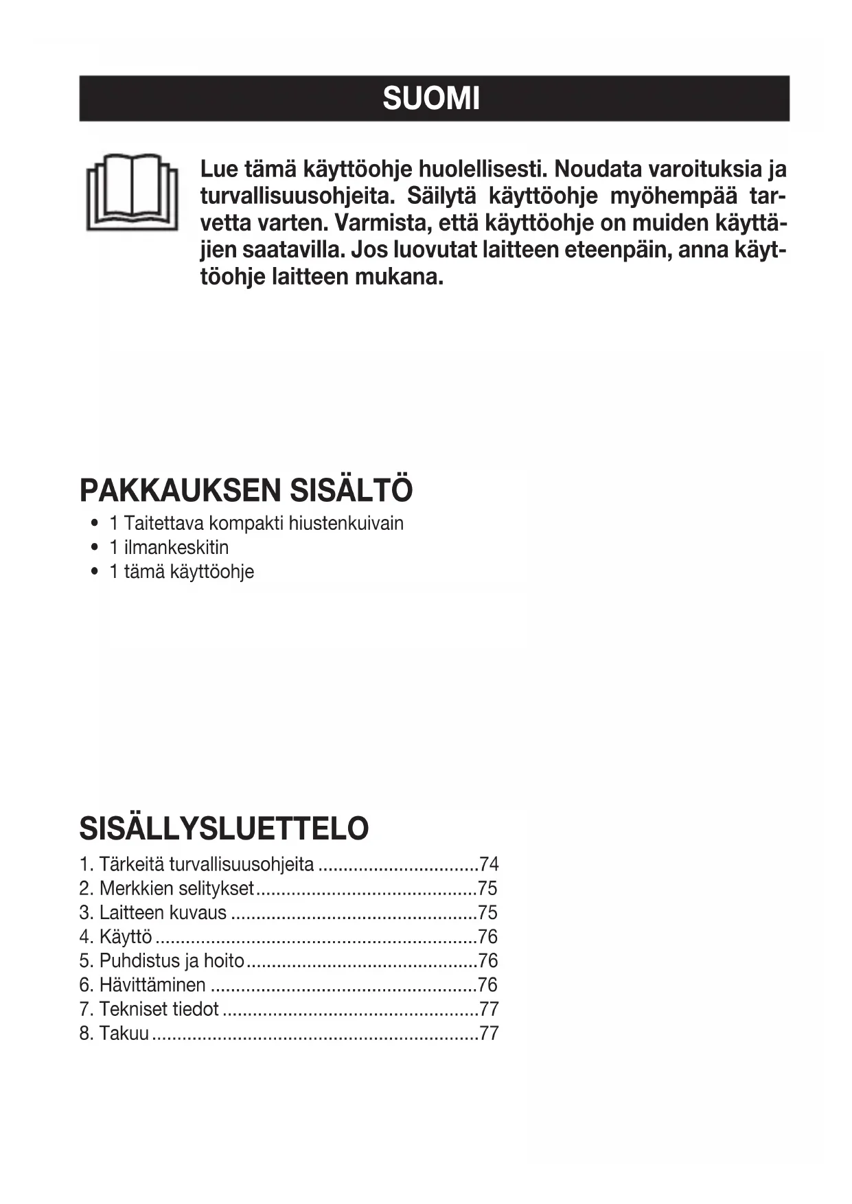 Du finner detaljert informasjon om garantien og garantivilkårene på det medfølgende garantiarket. Med forbehold om feil og endringer72 73 SUOMI Lue tämä käyttöohje huolellisesti. Noudata varoituksia ja turvallisuusohjeita. Säilytä käyttöohje myöhempää tar