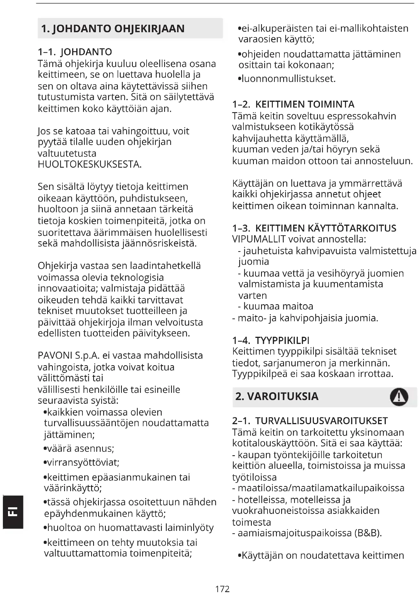 1–1. JOHDANTO Tämä ohjekirja kuuluu oleellisena osana keittimeen, se on luettava huolella ja sen on oltava aina käytettävissä siihen tutustumista varten. Sitä on säilytettävä keittimen koko käyttöiän ajan. Jos se katoaa tai vahingoittuu, voit pyytää tilalle uuden ohjekirjan valtuutetusta HUOLTOKESKUKSESTA. Sen sisältä löytyy tietoja keittimen oikeaan käyttöön, puhdistukseen, huoltoon ja siinä annetaan tärkeitä tietoja koskien toimenpiteitä, jotka on suoritettava äärimmäisen huolellisesti sekä mahdollisista jäännösriskeistä. Ohjekirja vastaa sen laadintahetkellä voimassa olevia teknologisia innovaatioita; valmistaja pidättää oikeuden tehdä kaikki tarvittavat tekniset muutokset tuotteilleen ja päivittää ohjekirjoja ilman velvoitusta edellisten tuotteiden päivitykseen. PAVONI S.p.A. ei vastaa mahdollisista vahingoista, jotka voivat koitua välittömästi tai välillisesti henkilöille tai esineille seuraavista syistä: