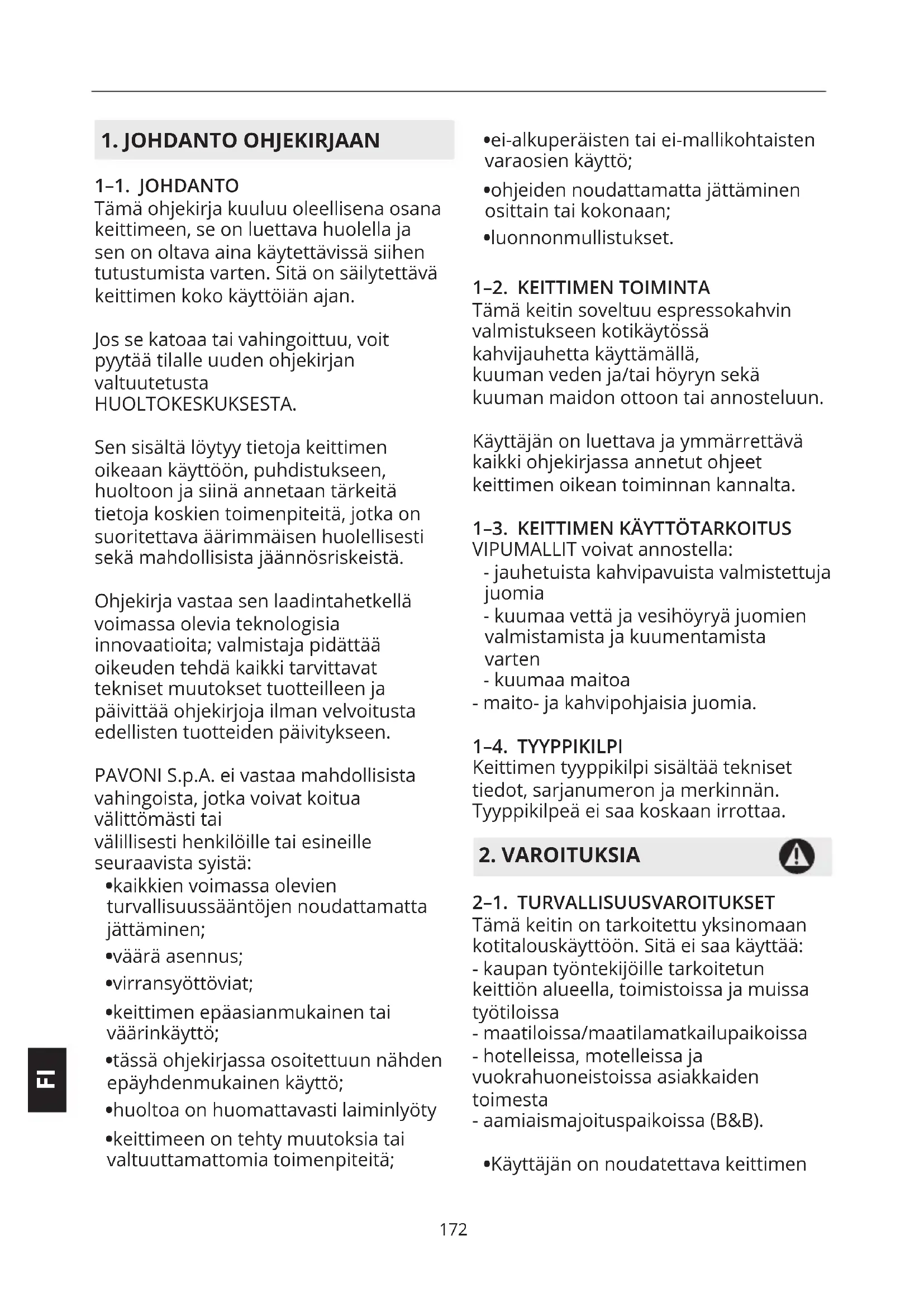 1–1. JOHDANTO Tämä ohjekirja kuuluu oleellisena osana keittimeen, se on luettava huolella ja sen on oltava aina käytettävissä siihen tutustumista varten. Sitä on säilytettävä keittimen koko käyttöiän ajan. Jos se katoaa tai vahingoittuu, voit pyytää tilalle uuden ohjekirjan valtuutetusta HUOLTOKESKUKSESTA. Sen sisältä löytyy tietoja keittimen oikeaan käyttöön, puhdistukseen, huoltoon ja siinä annetaan tärkeitä tietoja koskien toimenpiteitä, jotka on suoritettava äärimmäisen huolellisesti sekä mahdollisista jäännösriskeistä. Ohjekirja vastaa sen laadintahetkellä voimassa olevia teknologisia innovaatioita; valmistaja pidättää oikeuden tehdä kaikki tarvittavat tekniset muutokset tuotteilleen ja päivittää ohjekirjoja ilman velvoitusta edellisten tuotteiden päivitykseen. PAVONI S.p.A. ei vastaa mahdollisista vahingoista, jotka voivat koitua välittömästi tai välillisesti henkilöille tai esineille seuraavista syistä: