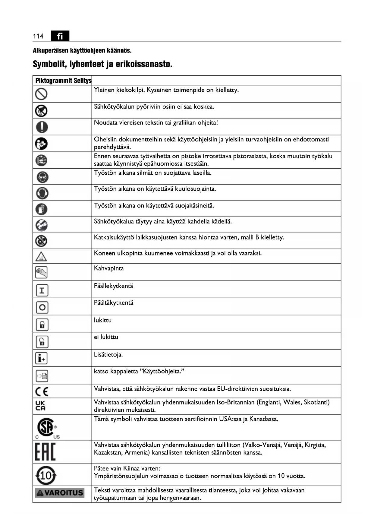 Alkuperäisen käyttöohjeen käännös. Symbolit, lyhenteet ja erikoissanasto. Piktogrammit Selitys Yleinen kieltokilpi. Kyseinen toimenpide on kielletty. Sähkötyökalun pyöriviin osiin ei saa koskea. Noudata viereisen tekstin tai grafiikan ohjeita! Oheisiin dokumentteihin sekä käyttöohjeisiin ja yleisiin turvaohjeisiin on ehdottomasti perehdyttävä. Ennen seuraavaa työvaihetta on pistoke irrotettava pistorasiasta, koska muutoin työkalu saattaa käynnistyä epähuomiossa itsestään. Työstön aikana silmät on suojattava laseilla. Työstön aikana on käytettävä kuulosuojainta. Työstön aikana on käytettävä suojakäsineitä. Sähkötyökalua täytyy aina käyttää kahdella kädellä. Katkaisukäyttö laikkasuojusten kanssa hiontaa varten, malli B kielletty. Koneen ulkopinta kuumenee voimakkaasti ja voi olla vaaraksi. Kahvapinta Päällekytkentä Päältäkytkentä lukittu ei lukittu Lisätietoja. katso kappaletta ”Käyttöohjeita.” Vahvistaa, että sähkötyökalun rakenne vastaa EU-direktiivien suosituksia. Vahvistaa sähkötyökalun yhdenmukaisuuden Iso-Britannian (Englanti, Wales, Skotlanti) direktiivien mukaisesti. Tämä symboli vahvistaa tuotteen sertifioinnin USA:ssa ja Kanadassa. Vahvistaa sähkötyökalun yhdenmukaisuuden tulliliiton (Valko-Venäjä, Venäjä, Kirgisia, Kazakstan, Armenia) kansallisten teknisten säännösten kanssa. Pätee vain Kiinaa varten: Ympäristönsuojelun voimassaolo tuotteen normaalissa käytössä on 10 vuotta. Teksti varoittaa mahdollisesta vaarallisesta tilanteesta, joka voi johtaa vakavaan työtapaturmaan tai jopa hengenvaaraan.115