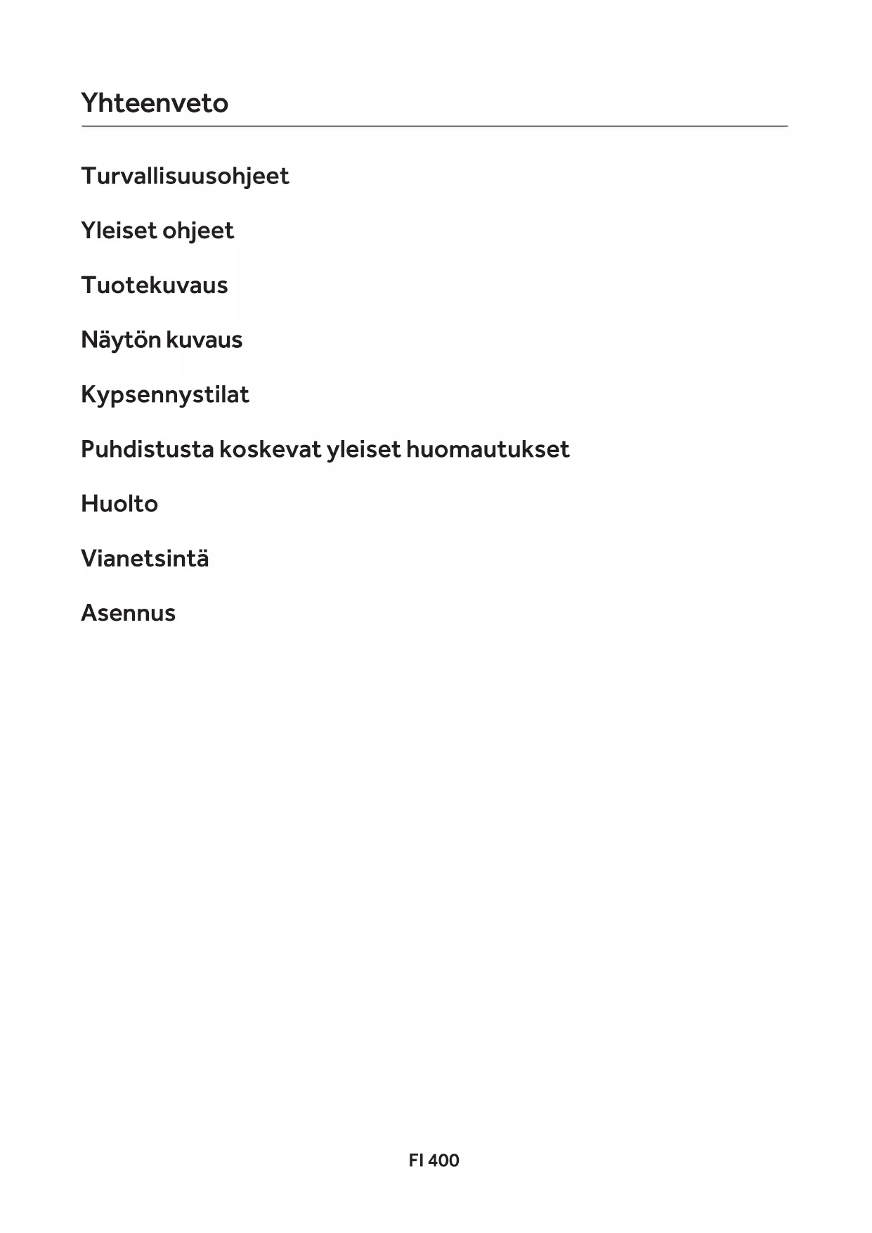 - Älä puhdista uunin ovilaseja karkealla tai hankaavalla materiaalilla tai terävillä metallikaapimilla, sillä ne voivat naarmuttaa pintaa ja aiheuttaa lasin rikkoutumisen. TurvallisuusohjeetFI 402