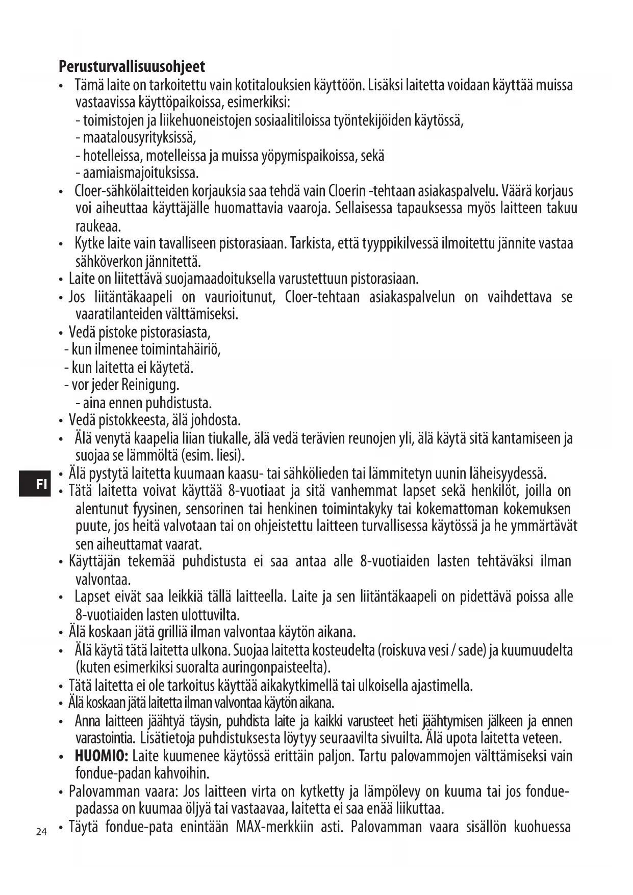 - Täytä fondue-pata enintään MAX-merkkiin asti. Palovamman vaara sisällön kuohuessa25