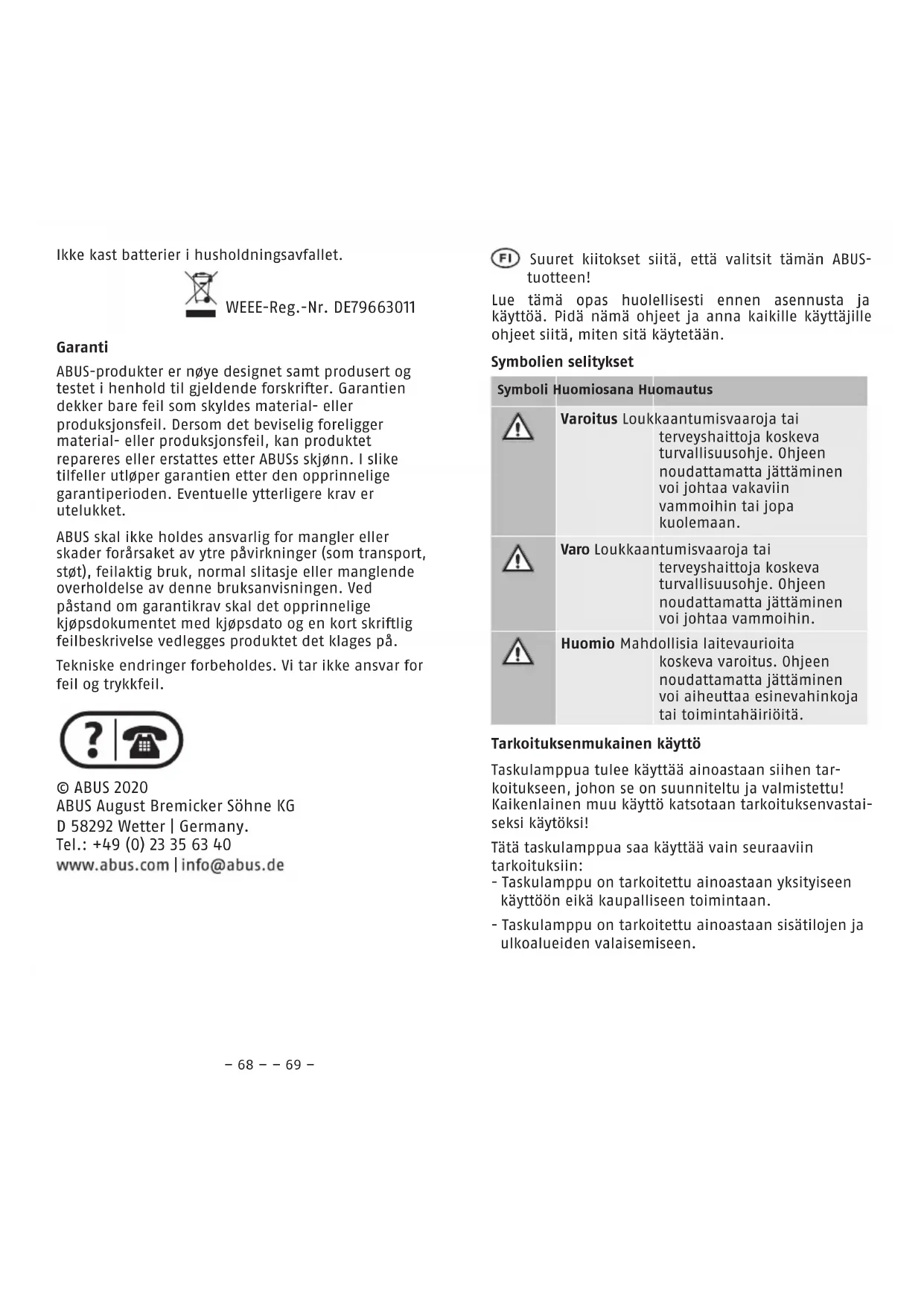 avaa sulje– 74 – – 75 – Hävittäminen Hävitä pakkaus samankaltaisten jätteiden kanssa. Toimita pahvi ja kartonki pahvinkeräykseen, kalvot ja muoviosat hyötyjätekeräykseen. Hävitä laite käytettyjä sähkö- ja elektroniikkalaitteita koskevan EY-direktiivin 2002/96/EY – WEEE (Waste Electrical and Electronic Equipment) – mukaisesti. Mahdollisiin asiaa koskeviin kysymyksiin vastaa kunnan jätehuollosta vastaava viranomainen. Tietoa käytettyjen laitteiden palautuspaikoista saat esim. kunnan tai kaupungin hallinnosta, kunnallisista jätehuoltoyhtiöistä tai kauppiaaltasi. Älä hävitä paristoja kotitalousjätteen mukana. Takuu ABUS-tuotteet on suunniteltu ja valmistettu erittäin huolellisesti ja testattu voimassa olevien määräysten mukaisesti. Takuu koskee ainoastaan vikoja, joiden voidaan katsoa johtuvan materiaali- tai valmistusvioista. Jos kyse on materiaali- tai valmistusviasta, tuote korjataan tai vaihdetaan ABUSin harkinnan mukaan. Takuu päättyy näissä tapauksissa alkuperäisen takuuajan päättyessä. Tätä laajemmat vaatimukset on nimenomaisesti suljettu pois. ABUS ei vastaa vioista eikä vaurioista, jotka johtuvat ulkoisista vaikutuksista (esim. kuljetuksesta, liiallisesta voimankäytöstä), epäasianmukaisesta käytöstä, normaalista kulumisesta tai tämän ohjeen noudattamatta jättämisestä. Takuuvaatimuksen voimaansaattamiseksi valituksen kohteena olevan tuotteen mukaan on liitettävä alkuperäinen ostokuitti, josta käy ilmi ostopäivä, ja lyhyt kirjallinen kuvaus viasta. Oikeus teknisiin muutoksiin pidätetään. Virheistä ja painovirheistä ei oteta vastuuta. WEEE-Reg.-Nr. DE79663011 © ABUS 2020 ABUS August Bremicker Söhne KG D 58292 Wetter | Germany. Tel.: +49 (0) 23 35 63 40