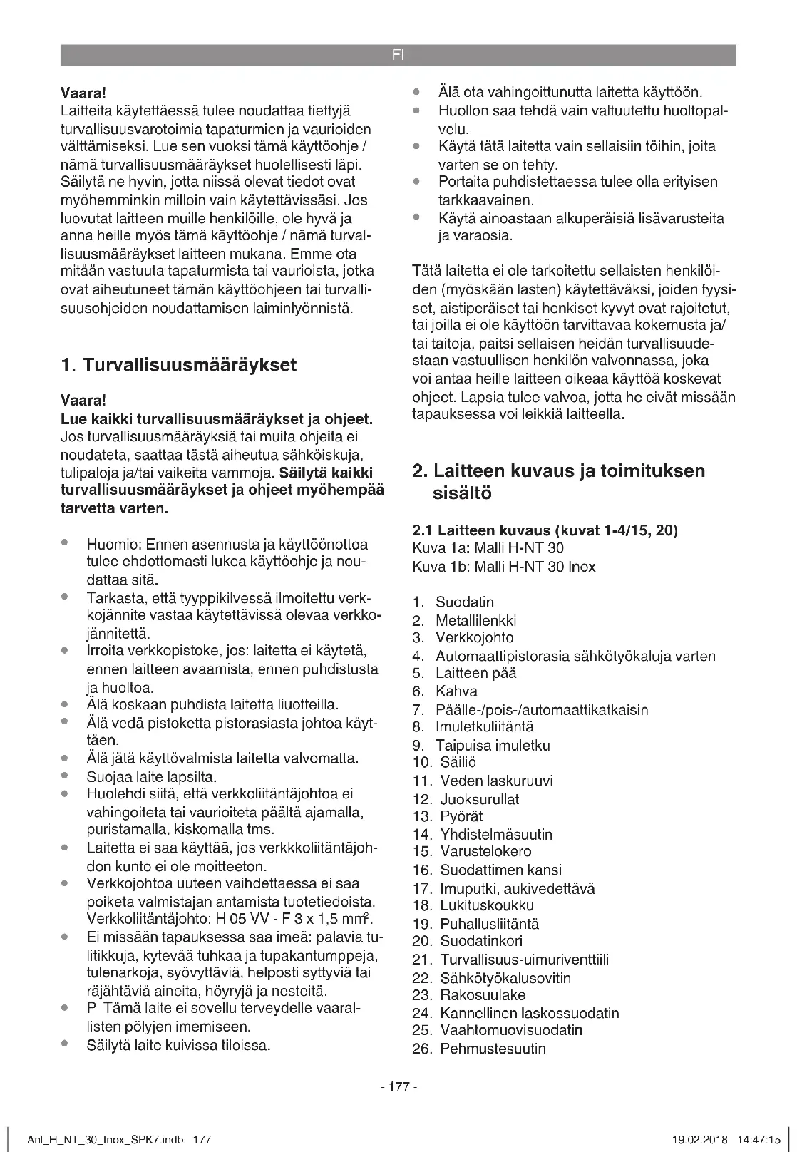 Varoitus! Tarkistakaa ennen käyttöönottoa, että tyyppikilven tiedot täsmäävät verkkotietojen kanssa. Anl_H_NT_30_Inox_SPK7.indb 178Anl_H_NT_30_Inox_SPK7.indb 178 19.02.2018 14:47:1519.02.2018 14:47:15FI