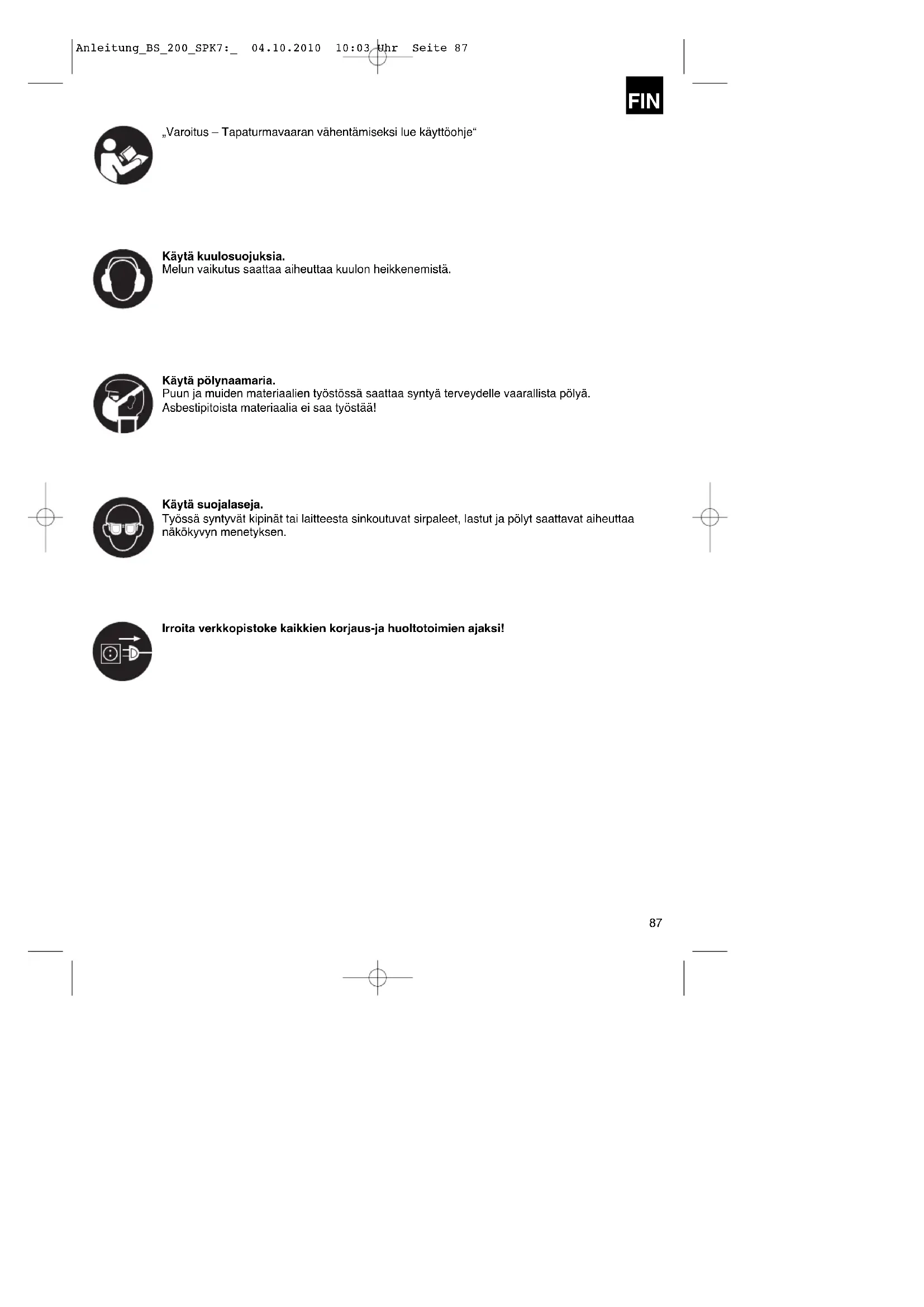 „Varoitus – Tapaturmavaaran vähentämiseksi lue käyttöohje“ Käytä kuulosuojuksia. Melun vaikutus saattaa aiheuttaa kuulon heikkenemistä. Käytä pölynaamaria. Puun ja muiden materiaalien työstössä saattaa syntyä terveydelle vaarallista pölyä. Asbestipitoista materiaalia ei saa työstää! Käytä suojalaseja. Työssä syntyvät kipinät tai laitteesta sinkoutuvat sirpaleet, lastut ja pölyt saattavat aiheuttaa näkökyvyn menetyksen. Irroita verkkopistoke kaikkien korjaus-ja huoltotoimien ajaksi! Anleitung_BS_200_SPK7:_ 04.10.2010 10:03 Uhr Seite 87 Huomio! Laitteita käytettäessä tulee noudattaa tiettyjä turvallisuusvarotoimia tapaturmien ja vaurioiden välttämiseksi. Lue sen vuoksi tämä käyttöohje / nämä turvallisuusmääräykset huolellisesti läpi. Säilytä käyttöohje hyvin, jotta siinä olevat tiedot ovat myöhemminkin milloin vain käytettävissäsi. Jos luovutat laitteen muille henkilöille, ole hyvä ja anna heille myös tämä käyttöohje / nämä turvallisuusmääräykset laitteen mukana. Emme ota mitään vastuuta tapaturmista tai vaurioista, jotka ovat aiheutuneet tämän käyttöohjeen tai turvallisuusohjeiden noudattamisen laiminlyönnistä.