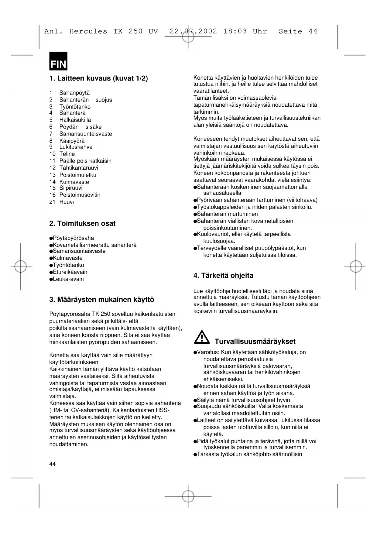 Lue käyttöohje huolellisesti läpi ja noudata siinä annettuja määräyksiä. Tutustu tämän käyttöohjeen avulla laitteeseen, sen oikeaan käyttöön sekä sitä koskeviin turvallisuusmääräyksiin. Turvallisuusmääräykset Varoitus: Kun käytetään sähkötyökaluja, on noudatettava peruslaatuisia turvallisuusmääräyksiä palovaaran, sähköiskuvaaran tai henkilövahinkojen ehkäisemiseksi. Noudata kaikkia näitä turvallisuusmääräyksiä ennen sahan käyttöä ja työn aikana. Säilytä nämä turvallisuusohjeet hyvin. Suojaudu sähköiskuilta! Vältä koskemasta vartalollasi maadoitettuihin osiin. Laitteet on säilytettävä kuivassa, lukitussa tilassa poissa lasten ulottuvilta silloin, kun niitä ei käytetä. Pidä työkalut puhtaina ja terävinä, jotta niillä voi työskennellä paremmin ja turvallisemmin. Tarkasta työkalun sähköjohto säännöllisin Anl. Hercules TK 250 UV 22.07.2002 18:03 Uhr Seite 44FIN