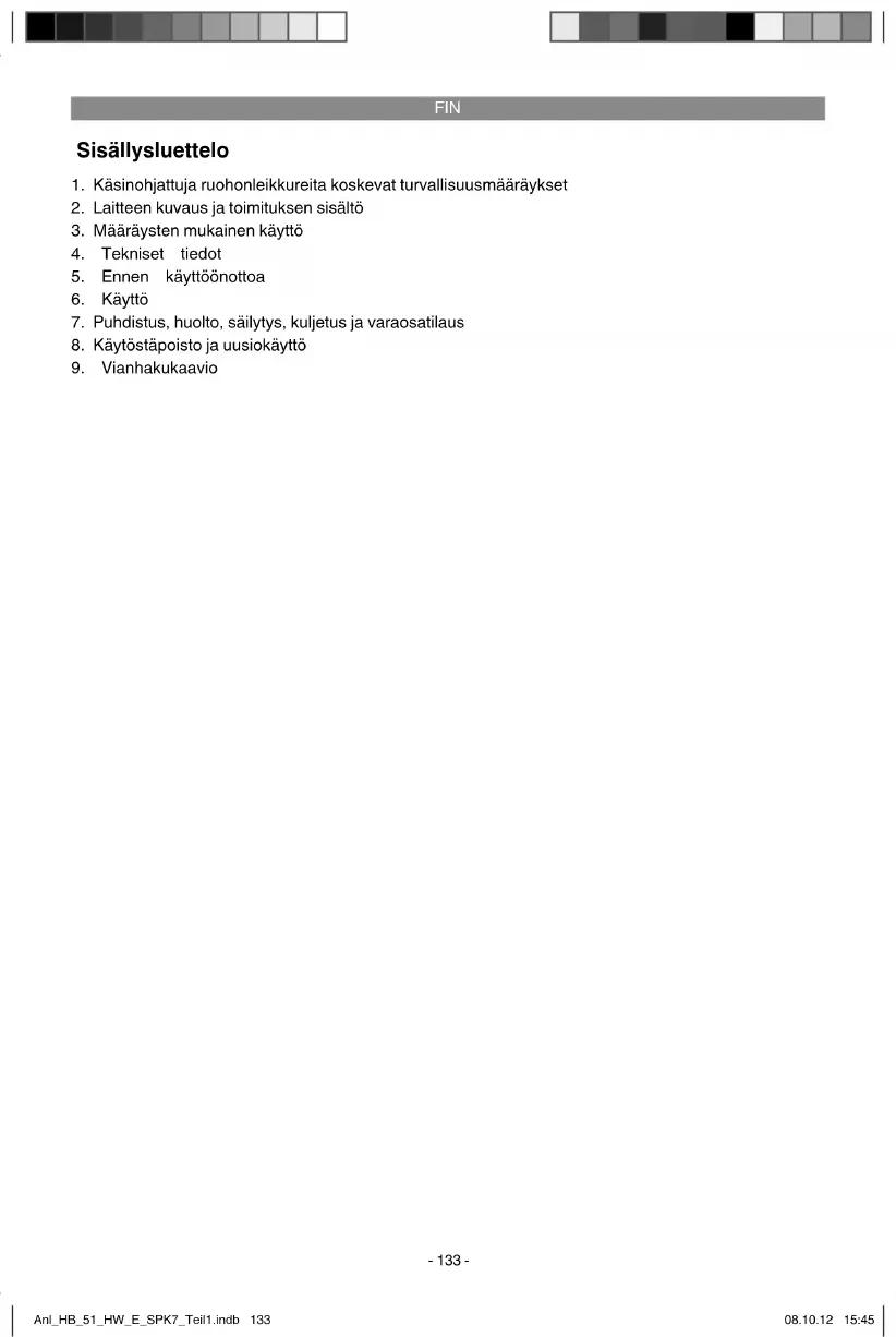 Koskee ainoastaan EU-maita Älä heitä sähkötyökaluja kotitalousjätteisiin! Euroopan direktiivin 2002/96/EY loppuunkäytetyistä sähkö- ja elektronisista laitteista ja sen kansallisek- si laiksi muuntamisen mukaan tulee käytetyt sähkötyökalut koota erikseen ja toimittaa ne ympäristöystä- välliseen kierrätykseen. Kierrätysvaihtoehto takaisinlähetykselle: Sähkölaitteen omistaja on velvoitettu laitteen palauttamisen vaihtoehtona vaikuttamaan siihen, että hänen luovuttamansa omaisuus hävitetään asianmukaisesti. Loppuun käytetty laite voidaan tätä varten luovuttaa myös keräyspisteeseen, joka suorittaa sen käytöstäpoiston kansallisten kierrätystalous- ja jätehuoltolakien tarkoittamalla tavalla. Tämä ei koske käytettyihin laitteisiin liitettyjä lisävarusteita ja apu- välineitä, joissa ei ole sähköosia. Tuotedokumentaation ja tuotteen mukana toimitettujen papereiden osittainenkin kopiointi tai muu monis- taminen on sallittu ainoastaan iSC GmbH:n nimenomaisella luvalla. Oikeus teknisiin muutoksiin pidätetään Anl_HB_51_HW_E_SPK7_Teil1.indb 147Anl_HB_51_HW_E_SPK7_Teil1.indb 147 08.10.12 15:4508.10.12 15:45FIN