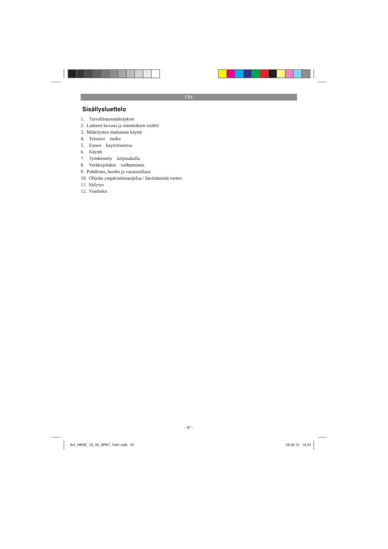 Säilytä laite ja sen varusteet valolta, kosteudelta ja pakkaselta suojatussa tilassa poissa lasten ulottuvilta. Paras säilytyslämpötila on 5°C ja 30°C välillä. Säilytä sähkötyökalut alkuperäispakkauk- sissaan. Anl_HEKE_18_35_SPK7_Teil1.indb 104Anl_HEKE_18_35_SPK7_Teil1.indb 104 16.05.12 14:3116.05.12 14:31FIN