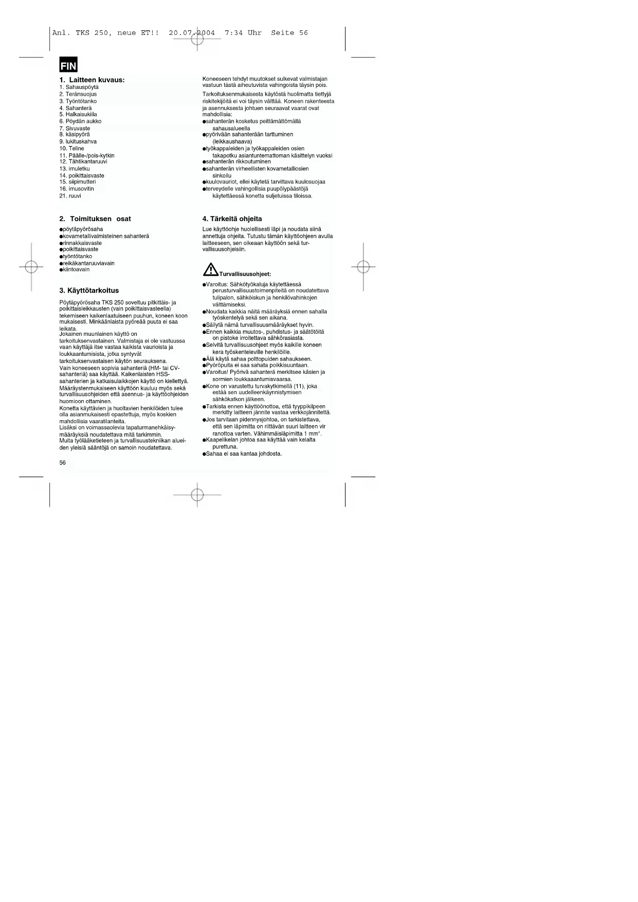Pöytäpyörösaha puretaan pakkauksesta ja tarkistetaan mahdollisten kuljetusvahinkojen varalta. Ennen käyttöönottoa on kaikki suojukset ja turvalaitteet asennettava määräysten mukaisesti. Sahanterän on voitava pyöriä vapaasti. Jos puuta on jo työstetty, varo vieraita osia kuten esim. nauloja ja ruuveja. Ennen käynnistyskytkimen toimentamista täytyy tarkistaa, että sahanterä on asennettu oikein ja kaikki liikkuvat osat kulkevat helposti. Tarkista ennen koneen liittämistä verkkoon, että tyyppikilven tiedot vastaavat käytettyä verkkojännitettä. Anl. TKS 250, neue ET!! 20.07.2004 7:34 Uhr Seite 5859 FIN