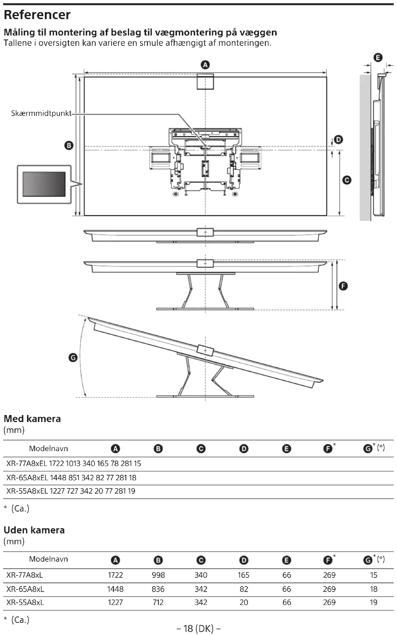 Johto ja kaapeli eivät ole kiertyneenä tai puristuksissa. VAROITUS Virtajohdon jne. virheellinen sijoitus saattaa aiheuttaa tulipalon tai sähköiskun oikosulun vuoksi. Muista tarkistaa valmis asennus turvallisuuden vuoksi. Muuta tietoa TV irrotetaan asennukseen nähden päinvastaisessa järjestyksessä. VAROITUS Suuren television siirtämiseen tarvitaan vähintään kaksi henkilöä (tai vähintään kolme henkilöä, jos television koko on yli 189,3 cm (75 tuumaa)) (paitsi Egypti). Suuren television siirtämiseen tarvitaan vähintään kaksi henkilöä (tai vähintään kolme henkilöä, jos television koko on yli 75 tuumaa (189,3 cm)) (vain Egypti).− 18 (FI) − Viitteet Mitat seinäasennuskiinnittimen seinälle asentamista varten Taulukon arvot voivat vaihdella hieman asennuksen mukaan. Ruudun keskipiste Sisältää kameran (mm) Mallinimi
