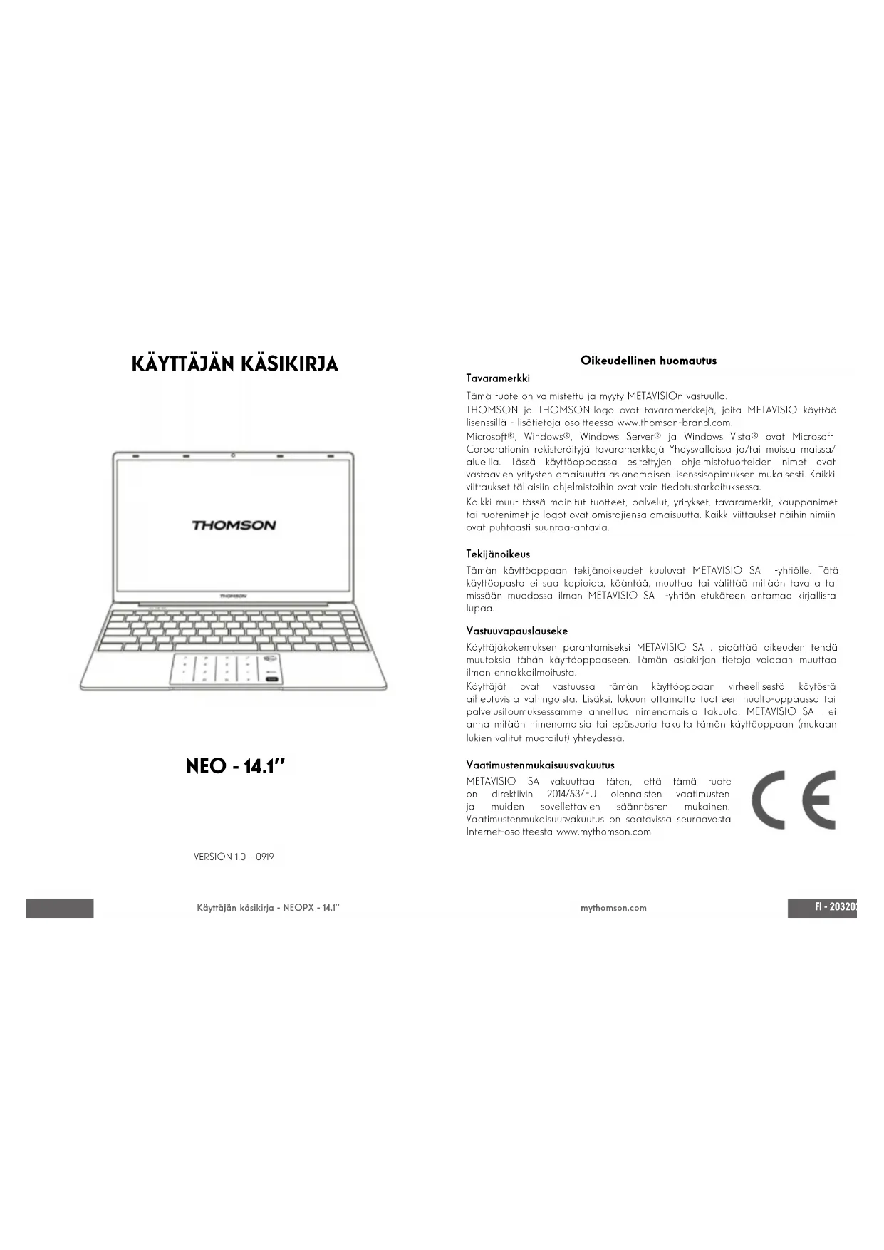 NEO - 14.1’’ VERSION 1.0 - 0919 Oikeudellinen huomautus Tavaramerkki Tämä tuote on valmistettu ja myyty METAVISIOn vastuulla. THOMSON ja THOMSON-logo ovat tavaramerkkejä, joita METAVISIO käyttää lisenssillä - lisätietoja osoitteessa www.thomson-brand.com. Microsoft®, Windows®, Windows Server® ja Windows Vista® ovat Microsoft Corporationin rekisteröityjä tavaramerkkejä Yhdysvalloissa ja/tai muissa maissa/ alueilla. Tässä käyttöoppaassa esitettyjen ohjelmistotuotteiden nimet ovat vastaavien yritysten omaisuutta asianomaisen lisenssisopimuksen mukaisesti. Kaikki viittaukset tällaisiin ohjelmistoihin ovat vain tiedotustarkoituksessa. Kaikki muut tässä mainitut tuotteet, palvelut, yritykset, tavaramerkit, kauppanimet tai tuotenimet ja logot ovat omistajiensa omaisuutta. Kaikki viittaukset näihin nimiin ovat puhtaasti suuntaa-antavia. Tekijänoikeus Tämän käyttöoppaan tekijänoikeudet kuuluvat METAVISIO SA -yhtiölle. Tätä käyttöopasta ei saa kopioida, kääntää, muuttaa tai välittää millään tavalla tai missään muodossa ilman METAVISIO SA -yhtiön etukäteen antamaa kirjallista lupaa. Vastuuvapauslauseke Käyttäjäkokemuksen parantamiseksi METAVISIO SA . pidättää oikeuden tehdä muutoksia tähän käyttöoppaaseen. Tämän asiakirjan tietoja voidaan muuttaa ilman ennakkoilmoitusta. Käyttäjät ovat vastuussa tämän käyttöoppaan virheellisestä käytöstä aiheutuvista vahingoista. Lisäksi, lukuun ottamatta tuotteen huolto-oppaassa tai palvelusitoumuksessamme annettua nimenomaista takuuta, METAVISIO SA . ei anna mitään nimenomaisia tai epäsuoria takuita tämän käyttöoppaan (mukaan lukien valitut muotoilut) yhteydessä. Vaatimustenmukaisuusvakuutus METAVISIO SA vakuuttaa täten, että tämä tuote on direktiivin 2014/53/EU olennaisten vaatimusten ja muiden sovellettavien säännösten mukainen. Vaatimustenmukaisuusvakuutus on saatavissa seuraavasta Internet-osoitteesta www.mythomson.comFI - 205204 - FI Käyttäjän käsikirja - NEOPX - 14.1’’ mythomson.com - Tärkeitä turvallisuusohjeita - Tätä laitetta tulisi käyttää ympäristössä, jossa ympäristön lämpötila on 5°C (41°F) ja 35°C (95°F) välillä. Älä altista laitetta sateelle tai kosteudelle ja pidä se erossa nesteistä. Jos laitteen päälle on valunut vettä tai muita nesteitä, katkaise virta välittömästi ja odota, että laite on täysin kuiva, ennen kuin kytket sen uudelleen päälle. Älä altista laitetta suoralle auringonvalolle. Älä käytä voimakkaita liuottimia, nestemäisiä pesuaineita tai muita kemikaaleja laitteen pinnalla tai sen lähellä, jotta laitteen pinta ei syöpyisi tai vaurioituisi. Älä altista laitetta pölyiselle ympäristölle. Älä käytä laitetta kaasuvuodon aikana. Älä altista laitetta voimakkaille magneetti- tai sähkökentille. Laite voidaan läpäistä lentokentän röntgenilmaisimien läpi. On kuitenkin suositeltavaa, ettet kuljeta laitettasi magneettisten ilmaisimien läpi tai altista sitä käsin pidettäville ilmaisimille. Älä aseta mitään esineitä laitteen päälle. Älä aseta laitetta epätasaiselle tai epävakaalle alustalle. Muista suojata laite putoamiselta tai muulta vahingoittumiselta. Älä jätä laitetta päälle kytkettynä tai latautuneena syliin tai muuhun kehon osaan lämpövammojen välttämiseksi. Kytke laite pois päältä, ennen kuin kuljetat sitä tai peität sen millään materiaalilla, joka ei salli optimaalista ilmankiertoa. Älä käytä vaurioituneita virtajohtoja, lisävarusteita tai muita laitteita laitteen kanssa. Suosittelemme käyttämään vain laitteen mukana toimitettuja lisävarusteita (virtalähde, kaapelit jne.). Käytä vain alkuperäisiä paristoja. Jos akku vaihdetaan väärään, seurauksena voi olla räjähdysvaara. Älä pura, muuta tai korjaa laitetta itse, muuten takuu raukeaa. Varmuuskopioi tärkeä sisältösi säännöllisesti, jotta vältät tietojen menettämisen. Yrityksemme ei ota vastuuta laitteiston tai ohjelmiston virheellisen käytön, huollon puutteen tai muun vahingossa tapahtuneen tapahtuman seurauksena tapahtuvasta laitteen sisältämien tietojen katoamisesta tai poistamisesta. Tämä tuote on suunniteltu siten, että osat ja komponentit voidaan kierrättää asianmukaisesti. Läpiviivatun pyörillä varustetun jäteastian symboli osoittaa, että laitetta ei saa hävittää yhdyskuntajätteen mukana. Tutustu elektronisten laitteiden hävittämistä koskeviin paikallisiin määräyksiin. Yliviivattu pyörillä varustetun jäteastian symboli osoittaa, että akkua ei saa hävittää yhdyskuntajätteen mukana. Tutustu paikallisiin määräyksiin akkujen hävittämisestä. Mahdollisten kuulovaurioiden välttämiseksi älä kuuntele korkeita äänitasoja pitkiä aikoja.FI - 207206 - FI Käyttäjän käsikirja - NEOPX - 14.1’’ mythomson.com - Laitteen esittely - Etunäkymä Vasen näkymä Oikea näkymä Huomautus : Laitteen ulkoasu ja jotkin ominaisuudet voivat vaihdella maittain, malleittain tai versioittain.