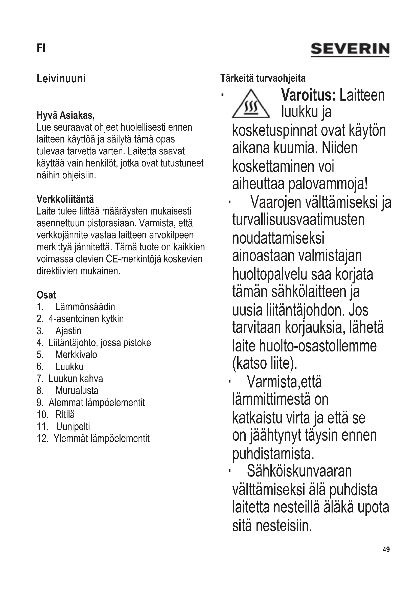 Leivinuuni Hyvä Asiakas, Lue seuraavat ohjeet huolellisesti ennen laitteen käyttöä ja säilytä tämä opas tulevaa tarvetta varten. Laitetta saavat käyttää vain henkilöt, jotka ovat tutustuneet näihin ohjeisiin. Verkkoliitäntä Laite tulee liittää määräysten mukaisesti asennettuun pistorasiaan. Varmista, että verkkojännite vastaa laitteen arvokilpeen merkittyä jännitettä. Tämä tuote on kaikkien voimassa olevien CE-merkintöjä koskevien direktiivien mukainen. Osat