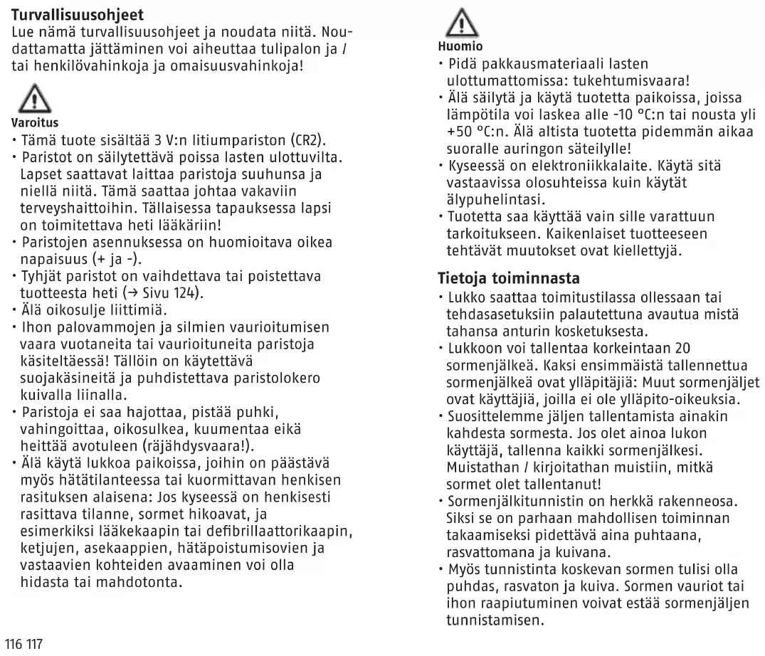 = 10x vihreänä: Sormi on tallennettu 10 sormenjäljellä. Muussa tapauksessa jatka sormenjälkien tallennusta LED Huomautus: ylläpitäjän sormenjälkiä ei saa tallentaa useampia kertoja, koska muuten niitä ei enää tunnisteta ylläpitäjänä. Sormenjälkiä ei tällöin enää voida tallentaa tai poistaa.122 123 Kaikki sormenjälkiä poistaminen (Tehdasasetusten palautus) Vain ylläpitäjä (2 ensimmäisenä tallennettu sormenjälkeä) voi poistaa tallennettuja sormen- jälkiä Lähes tyhjä akku Jos avatusta lukosta kuuluu ”S.O.S”-varoitusääni (3 lyhyttä, 3 pitkää, 3 lyhyttä ääntä), vaihda paristo (→ Sivu 3). Kun varoitusääni on kuulunut muutaman kerran, lukkoa ei voi sulkea ennen kuin paristo on vaihdettu. Lukko ei voi sulkeutua vahingossa pariston takia. Käytä vain korkealaatuisia merkkiparistoja, esim. Varta tai Panasonic. Tekniset tiedot Tarkkuus 508DPI Väärin perustein tapahtuvan hylkäämisen aste noin. 5 % (FRR) Väärin perustein tapahtuvan hyväksymisen aste <0,002% (FAR) Aikatunnistus <200 ms Käyttölämpötila-alue -10°C - +50°C Akkutyyppi 1x CR2 (850 mAh)