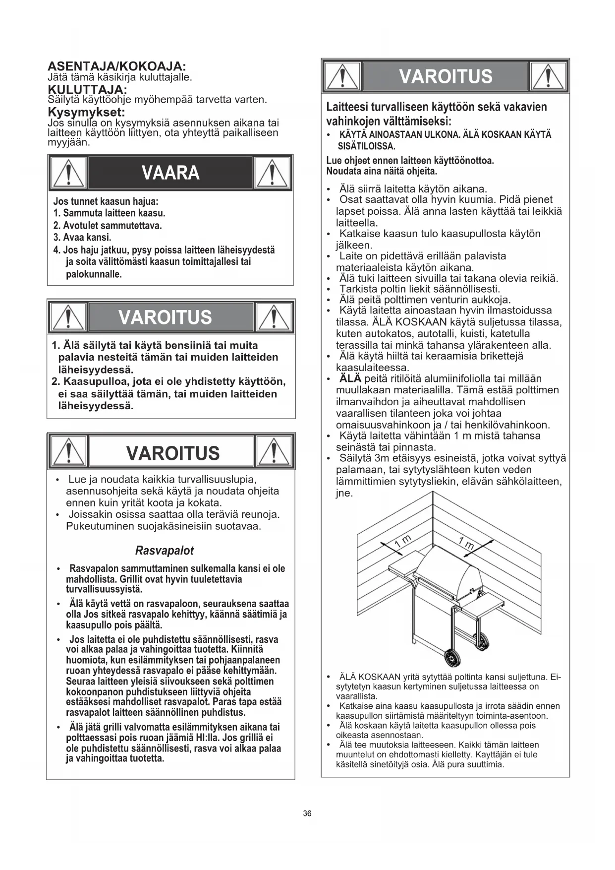 ei saa säilyttää tämän, tai muiden laitteiden läheisyydessä. Ÿ Lue ja noudata kaikkia turvallisuuslupia, asennusohjeita sekä käytä ja noudata ohjeita ennen kuin yrität koota ja kokata. Ÿ Joissakin osissa saattaa olla teräviä reunoja. Pukeutuminen suojakäsineisiin suotavaa. Rasvapalot Ÿ Rasvapalon sammuttaminen sulkemalla kansi ei ole mahdollista. Grillit ovat hyvin tuuletettavia turvallisuussyistä. Ÿ Älä käytä vettä on rasvapaloon, seurauksena saattaa olla Jos sitkeä rasvapalo kehittyy, käännä säätimiä ja kaasupullo pois päältä. Ÿ Jos laitetta ei ole puhdistettu säännöllisesti, rasva voi alkaa palaa ja vahingoittaa tuotetta. Kiinnitä huomiota, kun esilämmityksen tai pohjaanpalaneen ruoan yhteydessä rasvapalo ei pääse kehittymään. Seuraa laitteen yleisiä siivoukseen sekä polttimen kokoonpanon puhdistukseen liittyviä ohjeita estääksesi mahdolliset rasvapalot. Paras tapa estää rasvapalot laitteen säännöllinen puhdistus. Ÿ Älä jätä grilli valvomatta esilämmityksen aikana tai polttaessasi pois ruoan jäämiä HI:lla. Jos grilliä ei ole puhdistettu säännöllisesti, rasva voi alkaa palaa ja vahingoittaa tuotetta. Laitteesi turvalliseen käyttöön sekä vakavien vahinkojen välttämiseksi: Ÿ KÄYTÄ AINOASTAAN ULKONA. ÄLÄ KOSKAAN KÄYTÄSISÄTILOISSA. Lue ohjeet ennen laitteen käyttöönottoa. Noudata aina näitä ohjeita. Ÿ Älä siirrä laitetta käytön aikana.Ÿ Osat saattavat olla hyvin kuumia. Pidä pienet lapset poissa. Älä anna lasten käyttää tai leikkiä laitteella. Ÿ Katkaise kaasun tulo kaasupullosta käytön jälkeen. Ÿ Laite on pidettävä erillään palavista materiaaleista käytön aikana. Ÿ Älä tuki laitteen sivuilla tai takana olevia reikiä.Ÿ Tarkista poltin liekit säännöllisesti.Ÿ Älä peitä polttimen venturin aukkoja.Ÿ Käytä laitetta ainoastaan hyvin ilmastoidussa tilassa. ÄLÄ KOSKAAN käytä suljetussa tilassa, kuten autokatos, autotalli, kuisti, katetulla terassilla tai minkä tahansa ylärakenteen alla. Ÿ Älä käytä hiiltä tai keraamisia brikettejä kaasulaiteessa. Ÿ ÄLÄ peitä ritilöitä alumiinifoliolla tai millään muullakaan materiaalilla. Tämä estää polttimen ilmanvaihdon ja aiheuttavat mahdollisen vaarallisen tilanteen joka voi johtaa omaisuusvahinkoon ja / tai henkilövahinkoon. Ÿ Käytä laitetta vähintään 1 m mistä tahansa seinästä tai pinnasta. Ÿ Säilytä 3m etäisyys esineistä, jotka voivat syttyä palamaan, tai sytytyslähteen kuten veden lämmittimien sytytysliekin, elävän sähkölaitteen, jne. Ÿ ÄLÄ KOSKAAN yritä sytyttää poltinta kansi suljettuna. Ei-sytytetyn kaasun kertyminen suljetussa laitteessa onvaarallista.Ÿ Katkaise aina kaasu kaasupullosta ja irrota säädin ennenkaasupullon siirtämistä määriteltyyn toiminta-asentoon.Ÿ Älä koskaan käytä laitetta kaasupullon ollessa poisoikeasta asennostaan.Ÿ Älä tee muutoksia laitteeseen. Kaikki tämän laitteenmuuntelut on ehdottomasti kielletty. Kayttäjän ei tulekäsitellä sinetöityjä osia. Älä pura suuttimia. 1 m 1 m VAROITUS VAROITUS 36Kaasupullon Sijoittaminen Kaasupullo, joka on 6 kg tai vähemmän, voidaan sijoittaa maahan sivuhyllyn alle tai laitteen sisälle määriteltyyn paikkaan. Suuremmat kaasupullot on asetettava ainoastaan joko sivuhyllyn alle tai grillin taakse. Laitteeseen sijoitettavat kaasupullot saavat olla halkaisijaltaan enintään 340 mm ja suurimmalta korkeudeltaan 400 mm. Maahan asetettuja kaasupulloja ei saa sijoittaa keittolevyn alle. Säädintä koskevat vaatimukset Säädintä on käytettävä laitteen kanssa. Käytä ainoastaan kaasusäädintä, joka on toimitettu laitteen mukana. Jos säädintä ei ole toimitettu, käytä vain sertifioitua säädintä EN 16129 (virtausnopeus maks. 1,5 kg / h) ja joka on hyväksytty maassasi ja täyttää kaasun määritykset Teknisissä Tiedoissa. Letkua koskevat Vaatimukset Käytä vain hyväksyttyä letkua ja joka on sertifioitu EN standardin mukaisesti ja on enintään 1,5 m pitkä. Suomen osalta letkun pituus saa olla enintään 1,2 m. Ennen jokaista käyttöä, tarkista onko että letku katkennut tai kulunut. Varmista että letku ei ole mutkalla. Varmista, että yhdistettynä letku ei osu kuumiin pintoihin. Vaihda vaurioituneet letkut ennen laitteen käyttöä. Vaihda letku kansallisten vaatimusten mukaan. Turvallisuusvinkkejä Ÿ Ennen kaasupullon venttiilin avaamista, tarkista säätimen tiiviys. Ÿ Kun laite ei ole käytössä, sammuta kaikki säätimet ja kaasu. Ÿ Käytä pitkävartisia grilliastioita ja patakintaita palovammojen sekä roiskeiden välttämiseksi. Käytä suojakäsineitä käsitellessäsi kuumia osia. Ÿ Suurin keittolevyn kuormitus, jos sellainen on, ja sivuhyllyn, on 4,5 Kg. Kypsennysastian minimihalkaisija 200mm ja suurin halkaisija 260mm. HUOMAUTUS: Grilliäsi EI VOI varustaa Keittolevyllä! Ÿ Rasvakuppi (jos varusteena) on asetettava laitteeseen ja tyhjennettävä jokaisen käyttökerran jälkeen. Älä poista rasvakuppia ennenkuin laite on täysin jäähtynyt. Ÿ Ole varovainen, kun avaat kannen, koska avatessa saattaa tulla kuumaa höyryä. Ÿ Ole hyvin varovainen lasten, vanhusten, tai eläinten ollessa läheisyydessä. Ÿ Jos huomaat rasvan tai muiden kuumien materiaalien tippuvan laitteesta venttiilin, letkun tai säätimen päälle, katkaise kaasu heti. Määritä syy, korjaa se, sitten puhdista ja tarkasta venttiili, letku, ja säädin ennen jatkamista. Ÿ Suorita vuototesti. Ÿ Älä säilytä esineitä tai materiaaleja laitteen sisällä kärryssä, jotka estäisivät palamisilman virtauksen alapintaan joko ohjauspaneeliin tai tulipesän kulhoon. Ÿ Älä irrota tai vaihda kaasusäiliötä vähintään 3 m avotulesta tai muusta sytytyslähteestä. Käännä säätimet ja kaasupullo pois päältä kun niitä ei käytetä. Jos syttymistä ei tapahdu 5 sekunnissa, käännä polttimen ohjaimet pois päältä, odota 5 minuuttia ja toista sytytysmenettely. Jos poltin ei syty v