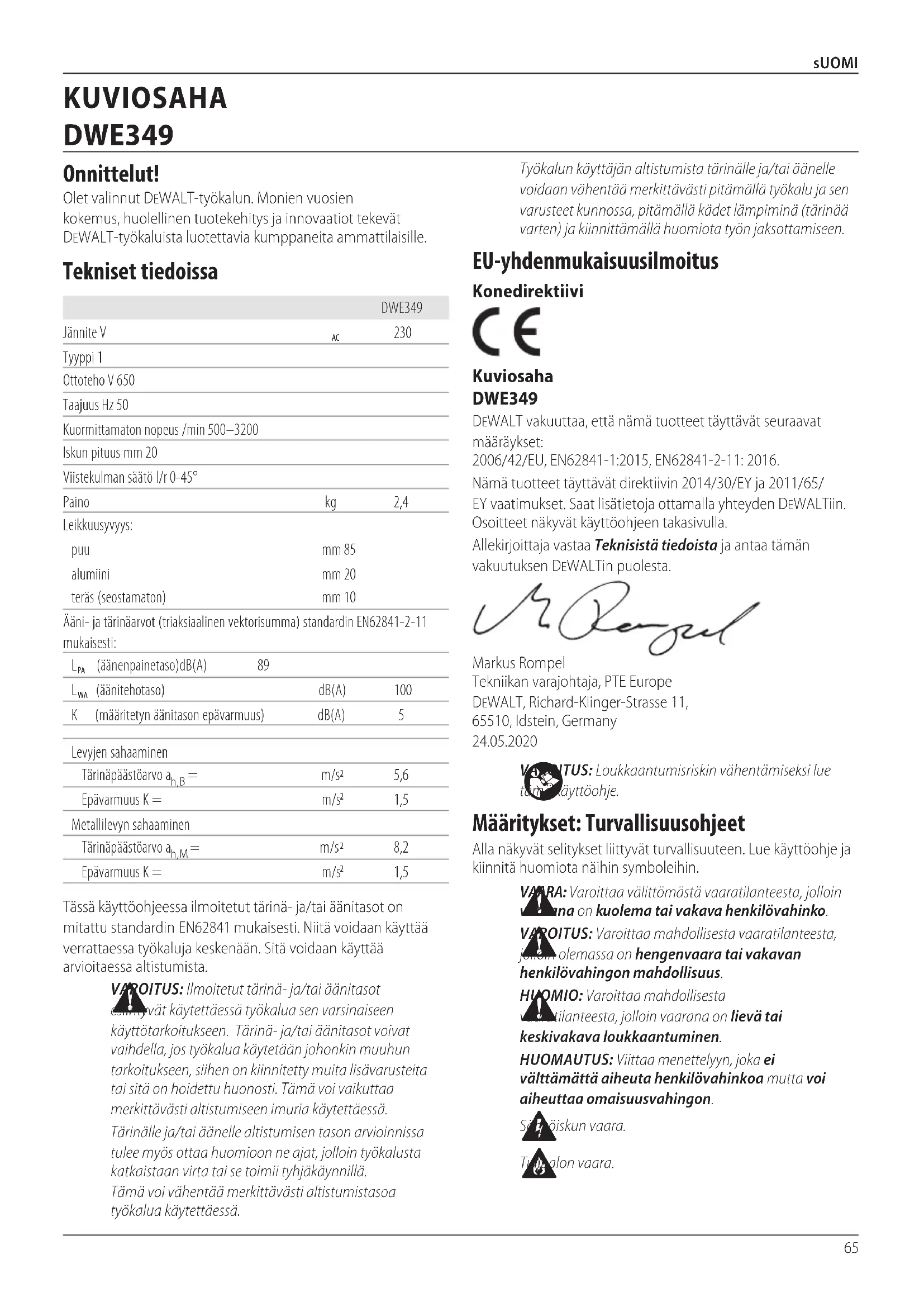 VAROITUS: Varoittaa mahdollisesta vaaratilanteesta, jolloin olemassa on hengenvaara tai vakavan henkilövahingonmahdollisuus. HUOMIO: Varoittaa mahdollisesta vaaratilanteesta, jolloin vaarana on lievä tai keskivakavaloukkaantuminen.HUOMAUTUS: Viittaa menettelyyn, joka ei välttämättä aiheuta henkilövahinkoa mutta voi aiheuttaaomaisuusvahingon. Sähköiskunvaara. Tulipalonvaara. EU‑yhdenmukaisuusilmoitus Konedirektiivi Kuviosaha DWE349 DeWALT vakuuttaa, että nämä tuotteet täyttävät seuraavat määräykset: 2006/42/EU, EN62841‑1:2015, EN62841‑2‑11:2016.Nämä tuotteet täyttävät direktiivin 2014/30/EY ja 2011/65/EY vaatimukset. Saat lisätietoja ottamalla yhteyden DeWALTiin. Osoitteet näkyvät käyttöohjeentakasivulla.Allekirjoittaja vastaa Teknisistä tiedoista ja antaa tämän vakuutuksen DeWALTinpuolesta.Markus Rompel Tekniikan varajohtaja, PTE Europe DeWALT, Richard‑Klinger‑Strasse 11, 65510, Idstein, Germany 24.05.2020Työkalun käyttäjän altistumista tärinälle ja/tai äänelle voidaan vähentää merkittävästi pitämällä työkalu ja sen varusteet kunnossa, pitämällä kädet lämpiminä (tärinää varten) ja kiinnittämällä huomiota työnjaksottamiseen.Tässä käyttöohjeessa ilmoitetut tärinä‑ ja/tai äänitasot on mitattu standardin EN62841mukaisesti. Niitä voidaan käyttää verrattaessa työkaluja keskenään. Sitä voidaan käyttää arvioitaessaaltistumista. VAROITUS: Ilmoitetut tärinä- ja/tai äänitasot esiintyvät käytettäessä työkalua sen varsinaiseen käyttötarkoitukseen. Tärinä- ja/tai äänitasot voivat vaihdella, jos työkalua käytetään johonkin muuhun tarkoitukseen, siihen on kiinnitetty muita lisävarusteita tai sitä on hoidettu huonosti. Tämä voi vaikuttaa merkittävästi altistumiseen imuriakäytettäessä.Tärinälle ja/tai äänelle altistumisen tason arvioinnissa tulee myös ottaa huomioon ne ajat, jolloin työkalusta katkaistaan virta tai se toimii tyhjäkäynnillä. Tämä voi vähentää merkittävästi altistumistasoa työkaluakäytettäessä.DWE349Jännite V