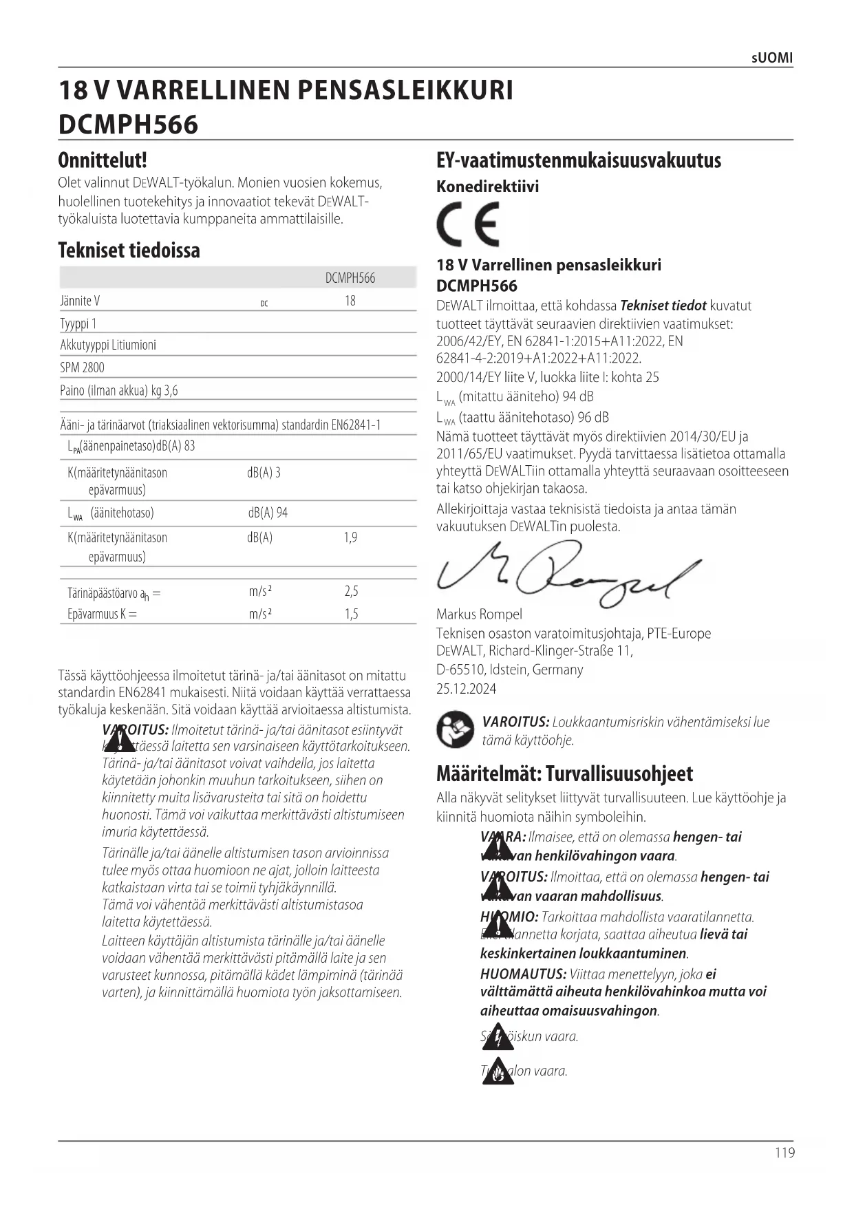 (taattu äänitehotaso) 96 dB Nämä tuotteet täyttävät myös direktiivien 2014/30/EU ja 2011/65/EU vaatimukset. Pyydä tarvittaessa lisätietoa ottamalla yhteyttä DeWALTiin ottamalla yhteyttä seuraavaan osoitteeseen tai katso ohjekirjan takaosa. Allekirjoittaja vastaa teknisistä tiedoista ja antaa tämän vakuutuksenDeWALTin puolesta. Markus Rompel Teknisen osaston varatoimitusjohtaja, PTE-Europe DeWALT, Richard-Klinger-Straße 11, D-65510, Idstein, Germany