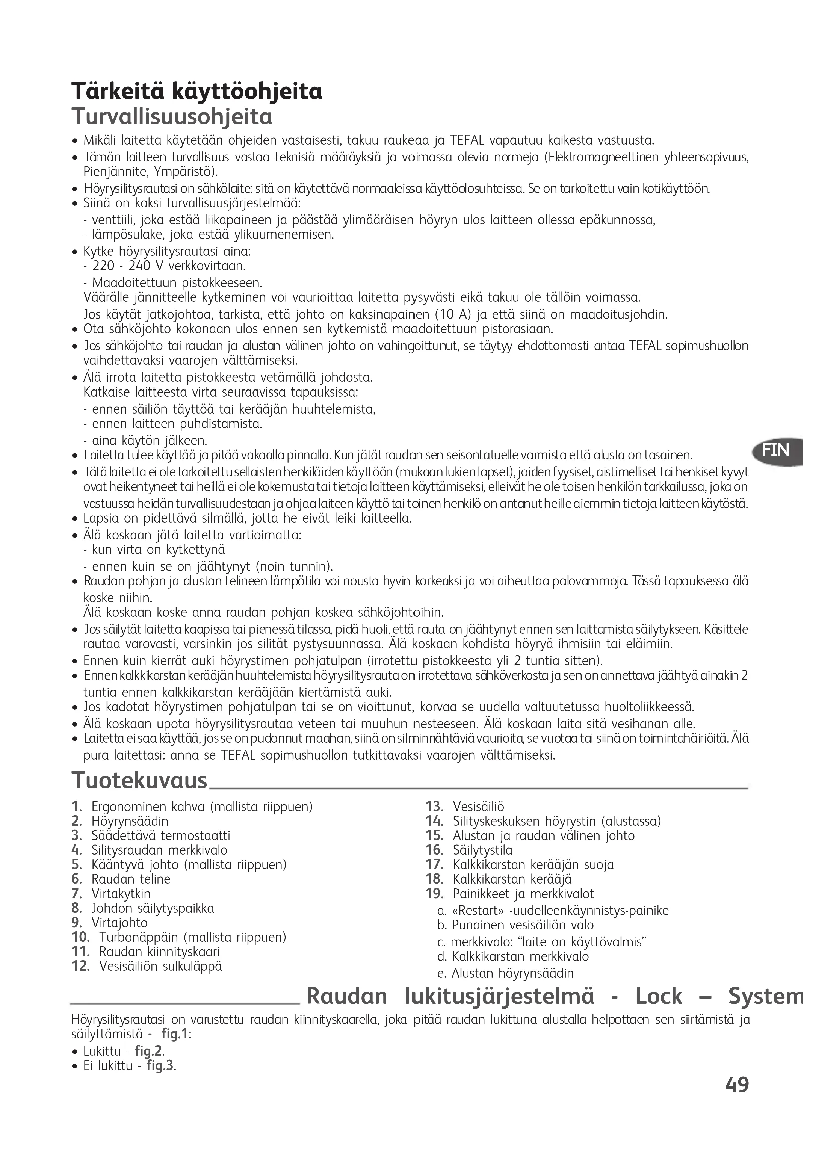 a. «Restart» -uudelleenkäynnistys-painike b. Punainen vesisäiliön valo c. merkkivalo: “laite on käyttövalmis” d. Kalkkikarstan merkkivalo e. Alustan höyrynsäädin Tuotekuvaus Raudan lukitusjärjestelmä - Lock – System Höyrysilitysrautasi on varustettu raudan kiinnityskaarella, joka pitää raudan lukittuna alustalla helpottaen sen siirtämistä ja säilyttämistä - fig.1: