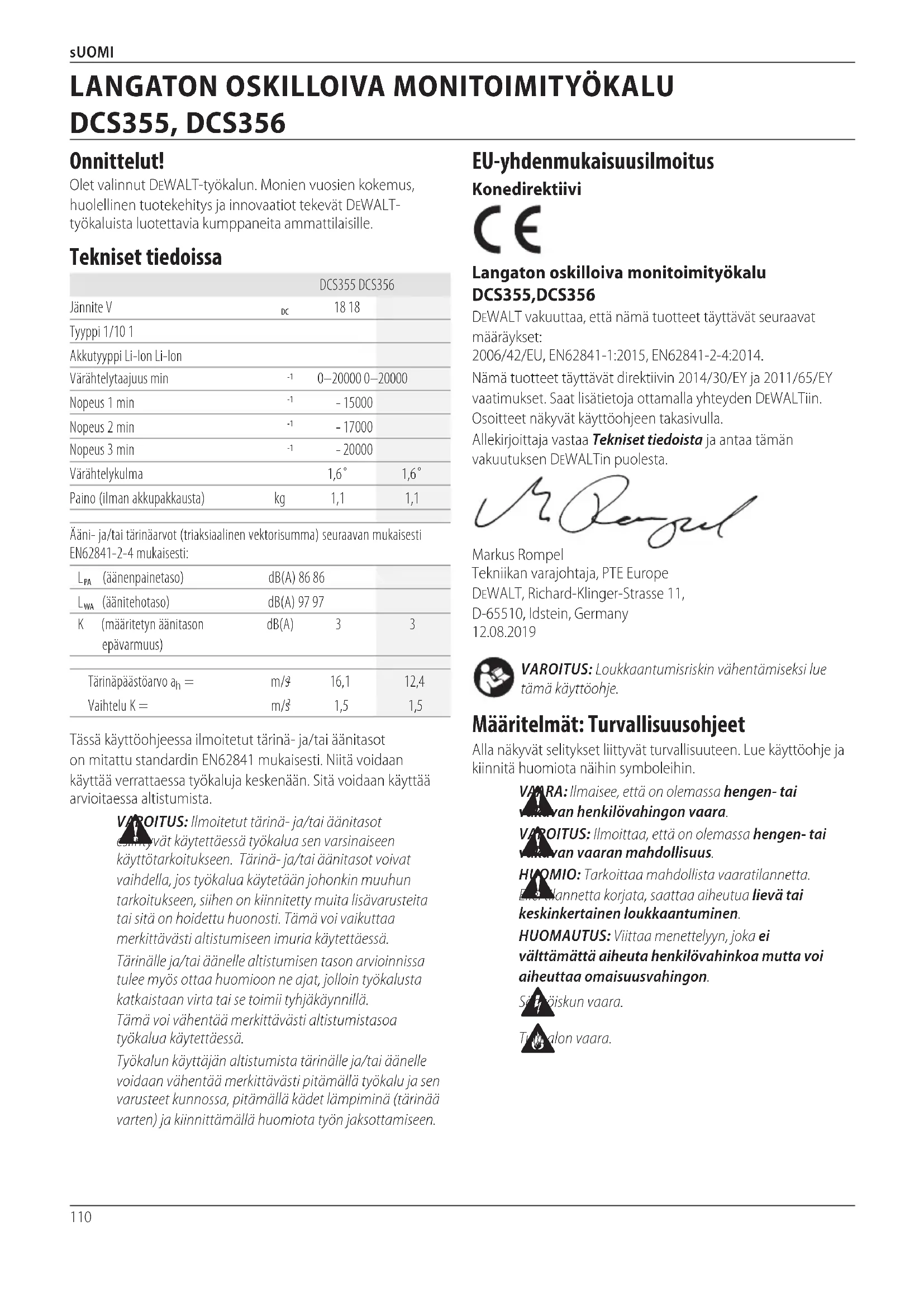 VAROITUS: Ilmoitetut tärinä- ja/tai äänitasot esiintyvät käytettäessä työkalua sen varsinaiseen käyttötarkoitukseen. Tärinä- ja/tai äänitasot voivat vaihdella, jos työkalua käytetään johonkin muuhun tarkoitukseen, siihen on kiinnitetty muita lisävarusteita tai sitä on hoidettu huonosti. Tämä voi vaikuttaa merkittävästi altistumiseen imuriakäytettäessä. Tärinälle ja/tai äänelle altistumisen tason arvioinnissa tulee myös ottaa huomioon ne ajat, jolloin työkalusta katkaistaan virta tai se toimii tyhjäkäynnillä. Tämä voi vähentää merkittävästi altistumistasoa työkaluakäytettäessä. Työkalun käyttäjän altistumista tärinälle ja/tai äänelle voidaan vähentää merkittävästi pitämällä työkalu ja sen varusteet kunnossa, pitämällä kädet lämpiminä (tärinää varten) ja kiinnittämällä huomiota työnjaksottamiseen. EU-yhdenmukaisuusilmoitus Konedirektiivi Langaton oskilloiva monitoimityökalu DCS355, DCS356 DeWALT vakuuttaa, että nämä tuotteet täyttävät seuraavat määräykset: 2006/42/EU, EN62841-1:2015, EN62841-2-4:2014. Nämä tuotteet täyttävät direktiivin 2014/30/EY ja 2011/65/EY vaatimukset. Saat lisätietoja ottamalla yhteyden DeWALTiin. Osoitteet näkyvät käyttöohjeentakasivulla. Allekirjoittaja vastaa Tekniset tiedoista ja antaa tämän vakuutuksen DeWALTinpuolesta. Markus Rompel Tekniikan varajohtaja, PTE Europe DeWALT, Richard-Klinger-Strasse 11, D-65510, Idstein, Germany