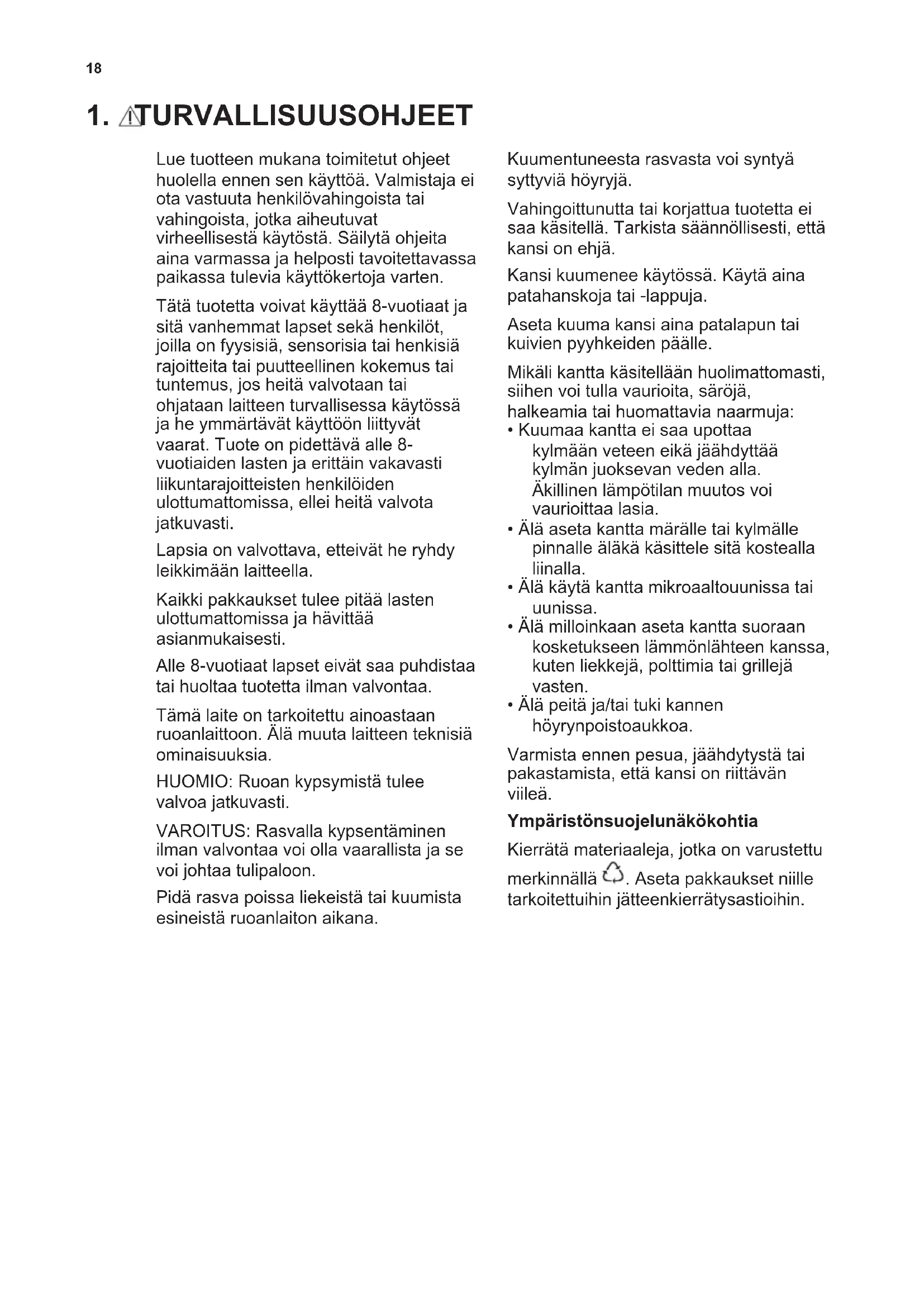 GUARANTEE Customer Service Centres Point of Service Industriestrasse 10 5506 Mägenwil Le Trési 6 1028 Préverenges Via Violino 11 6928 Manno Morgenstrasse 131 3018 Bern Langgasse 10 9008 St. Gallen Am Mattenhof 4a/b 6010 Kriens Schlossstrasse 1 4133 Pratteln Comercialstrasse 19 7000 Chur Spare parts service Industriestrasse 10, 5506 Mägenwil, Tel. 0848 848 111 Specialist advice/Sale Badenerstrasse 587, 8048 Zürich, Tel. 044 405 81 11 16Warranty For each product we provide a two-year guarantee from the date of purchase or delivery to the consumer (with a guarantee certificate, invoice or sales receipt serving as proof). The guarantee covers the costs of materials, labour and travel. The guarantee will lapse if the operating instructions and conditions of use are not adhered to, if the product is incorrectly installed, or in the event of damage caused by external influences, force majeure, intervention by third parties or the use of non-genuine components. ENGLISH 171. TURVALLISUUSOHJEET Lue tuotteen mukana toimitetut ohjeet huolella ennen sen käyttöä. Valmistaja ei ota vastuuta henkilövahingoista tai vahingoista, jotka aiheutuvat virheellisestä käytöstä. Säilytä ohjeita aina varmassa ja helposti tavoitettavassa paikassa tulevia käyttökertoja varten. Tätä tuotetta voivat käyttää 8-vuotiaat ja sitä vanhemmat lapset sekä henkilöt, joilla on fyysisiä, sensorisia tai henkisiä rajoitteita tai puutteellinen kokemus tai tuntemus, jos heitä valvotaan tai ohjataan laitteen turvallisessa käytössä ja he ymmärtävät käyttöön liittyvät vaarat. Tuote on pidettävä alle 8- vuotiaiden lasten ja erittäin vakavasti liikuntarajoitteisten henkilöiden ulottumattomissa, ellei heitä valvota jatkuvasti. Lapsia on valvottava, etteivät he ryhdy leikkimään laitteella. Kaikki pakkaukset tulee pitää lasten ulottumattomissa ja hävittää asianmukaisesti. Alle 8-vuotiaat lapset eivät saa puhdistaa tai huoltaa tuotetta ilman valvontaa. Tämä laite on tarkoitettu ainoastaan ruoanlaittoon. Älä muuta laitteen teknisiä ominaisuuksia. HUOMIO: Ruoan kypsymistä tulee valvoa jatkuvasti. VAROITUS: Rasvalla kypsentäminen ilman valvontaa voi olla vaarallista ja se voi johtaa tulipaloon. Pidä rasva poissa liekeistä tai kuumista esineistä ruoanlaiton aikana. Kuumentuneesta rasvasta voi syntyä syttyviä höyryjä. Vahingoittunutta tai korjattua tuotetta ei saa käsitellä. Tarkista säännöllisesti, että kansi on ehjä. Kansi kuumenee käytössä. Käytä aina patahanskoja tai -lappuja. Aseta kuuma kansi aina patalapun tai kuivien pyyhkeiden päälle. Mikäli kantta käsitellään huolimattomasti, siihen voi tulla vaurioita, säröjä, halkeamia tai huomattavia naarmuja: