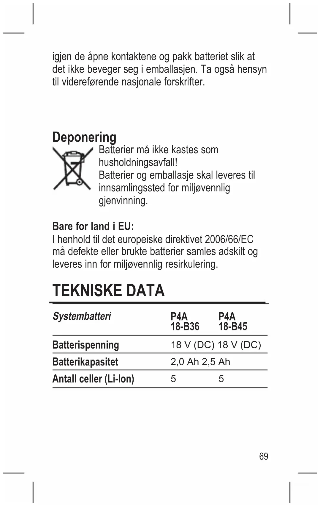 Älä käytä kemiallisia aineita akun puhdistami- seen. Kuljetus Li-ion-akkuihin sovelletaan vaarallisia aineita kos- kevia määräyksiä. Käyttäjä saa kuljettaa akkuja lii- kenteessä ilman erikoistoimenpiteitä. Pakkausta ja merkintää koskevat erikoisvaatimuk- set on huomioitava, jos lähetys tehdään kolman- sien osapuolten kautta (esim. lentorahtina tai huo- lintaliikkeen välityksellä). Lähetystä varten tuote täytyy pakata vaarallisten aineiden asiantuntijan neuvojen mukaan. Lähetä vain sellaisia akkuja, joiden kotelo on vau- rioitumaton. Suojaa navat teipillä ja pakkaa akku 74niin, ettei se pääse liikkumaan pakkauksessa. Huo- mioi myös mahdolliset tätä pidemmälle menevät maakohtaiset määräykset. Hävitys Älä heitä akkuja talousjätteisiin! Toimita akut ja pakkausmateriaalit ym- päristöystävälliseen jätteiden kierrätyk- seen. Koskee vain EU-maita: Eurooppalaisen direktiivin 2006/66/EY määräys- ten mukaisesti vialliset tai käytöstä poistetut akut täytyy kerätä erikseen ja toimittaa asianmukaiseen kierrätyspisteeseen. Tekniset Tiedot Järjestelmäakku P4A 18-B36 P4A 18-B45 Akkujännite 18 V (DC) 18 V (DC) Akkukapasiteetti 2,0 Ah 2,5 Ah Kennojen lukumäärä (Li-ion)