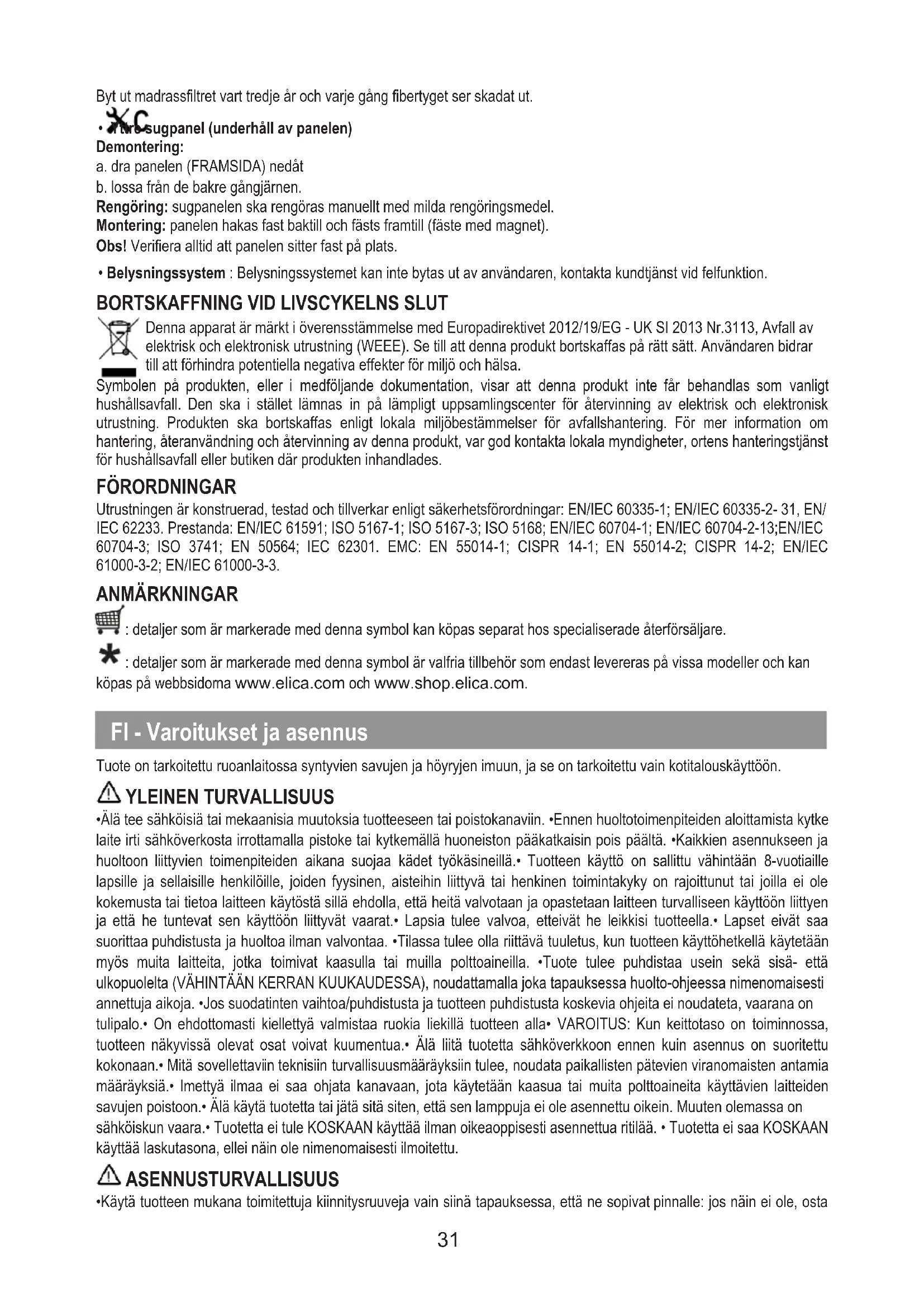 Laite on suunniteltu, testattu ja valmistettu seuraavien turvallisuusmääräysten mukaisesti: EN/IEC 60335-1; EN/IEC 60335-2- 31, EN/IEC 62233. Suorituskyky: EN/IEC 61591; ISO 5167-1; ISO 5167-3; ISO 5168; EN/IEC 60704-1; EN/IEC 60704-2-13;EN/IEC 60704-3; ISO 3741; EN 50564; IEC 62301. EMC: EN 55014-1; CISPR 14-1; EN 55014-2; CISPR 14-2; EN/IEC 61000-3-2; EN/IEC 61000-3-3. HUOMAUTUKSET : osat, joissa on tämä symboli, voidaan ostaa erikseen erikoistuneista jälleenmyymälöistä. : osat, joissa on tämä symboli, ovat valinnaisia lisävarusteita, jotka toimitetaan vain joitakin malleja varten ja jotka voidaan ostaa sivustoilla www.elica.com ja www.shop.elica.com. NO - Advarsler og installasjon Produktet er utviklet for avtrekk av røyk og damp fra matlaging og er kun ment til hjemmebruk. GENERELL SIKKERHET