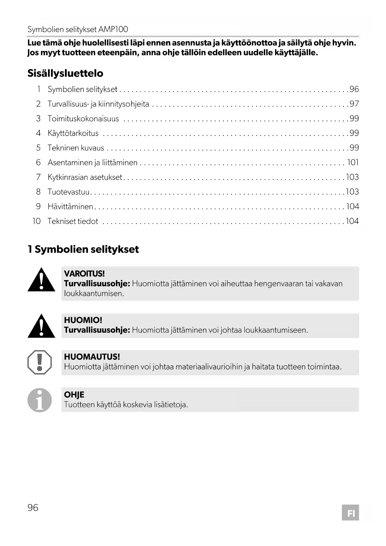 - Lue tämä ohje huolellisesti läpi ennen asennusta ja käyttöönottoa ja säilytä ohje hyvin. Jos myyt tuotteen eteenpäin, anna ohje tällöin edelleen uudelle käyttäjälle. Sisällysluettelo 1 Symbolien selitykset p. 96