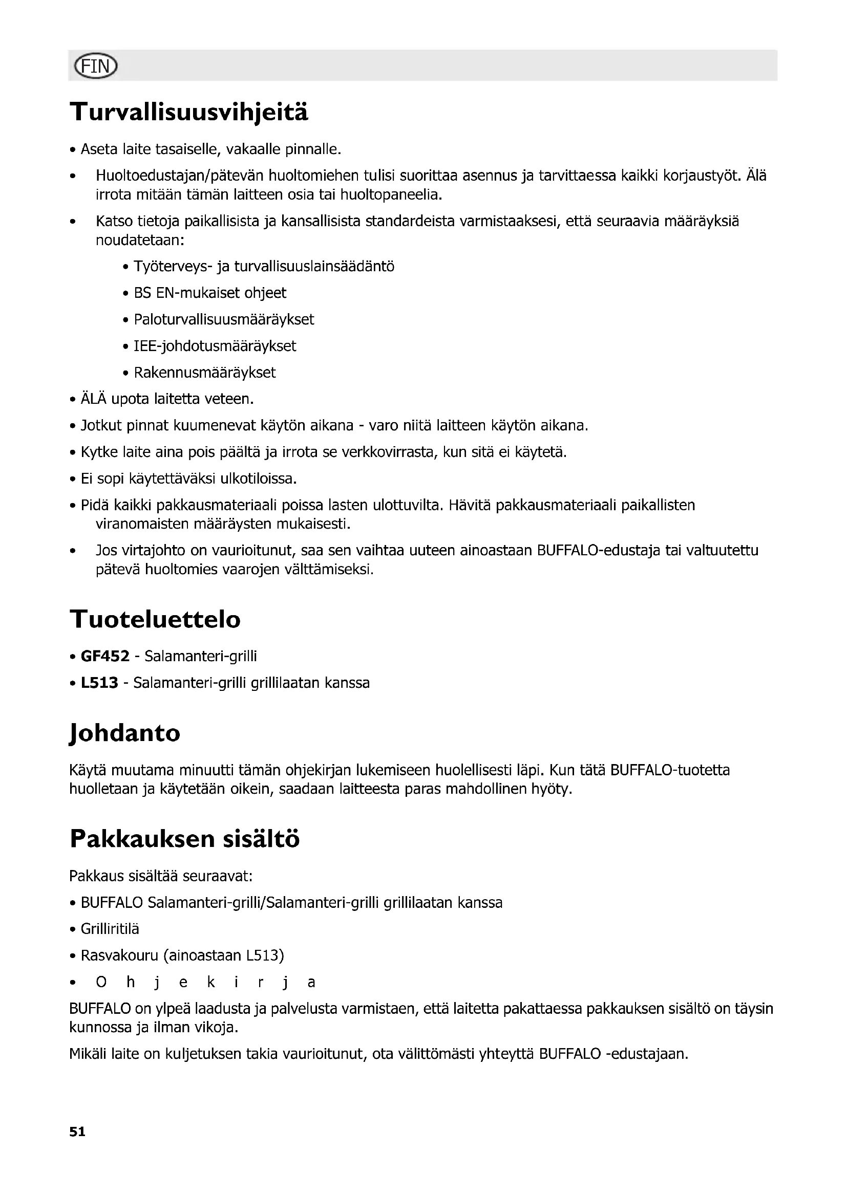 - L513 - Salamanteri-grilli grillilaatan kanssa Johdanto Käytä muutama minuutti tämän ohjekirjan lukemiseen huolellisesti läpi. Kun tätä BUFFALO-tuotetta huolletaan ja käytetään oikein, saadaan laitteesta paras mahdollinen hyöty. Pakkauksen sisältö Pakkaus sisältää seuraavat: