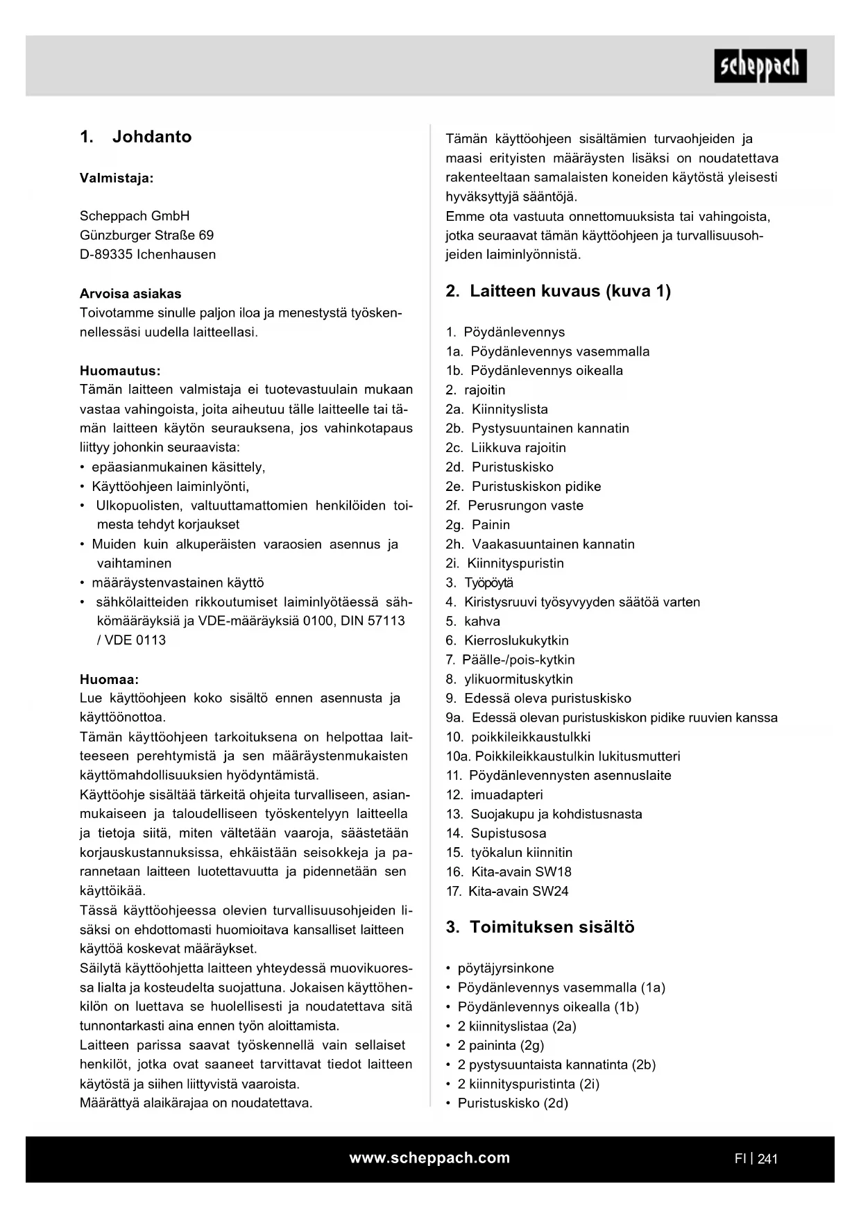 Valmistaja: Scheppach GmbH Günzburger Straße 69 D-89335 Ichenhausen Arvoisa asiakas Toivotamme sinulle paljon iloa ja menestystä työsken- nellessäsi uudella laitteellasi. Huomautus: Tämän laitteen valmistaja ei tuotevastuulain mukaan vastaa vahingoista, joita aiheutuu tälle laitteelle tai tä- män laitteen käytön seurauksena, jos vahinkotapaus liittyy johonkin seuraavista:
