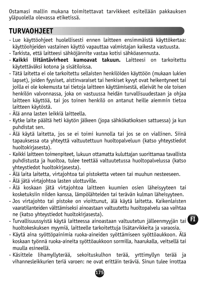 - Lisez attentivement le mode d’emploi avant la première utilisation de votre appareil : une utilisation non conforme au mode d’emploi dégagerait le fabricant de toute responsabilité. - Vérifiez que la tension d’alimentation de votre appareil correspond bien à celle de votre installation électrique. - Toute erreur de branchement annule la garantie. Votre appareil est destiné à un usage domestique à l’intérieur de la maison. - Cet appareil n'est pas prévu pour être utilisé par des personnes (y compris les enfants), dont les capacités physiques, sensorielles ou mentales sont réduites, ou des personnes dénuées d'expérience ou de connaissance, sauf si elles ont pu bénéficier, par l'intermédiaire d'une personne responsable de leur sécurité, d'une surveillance ou d'instructions préalables concernant l'utilisation de l'appareil. - Il convient de surveiller les enfants pour s’assurer qu’ils ne jouent pas avec l’appareil. - Débranchez votre appareil dès que vous cessez de l’utiliser (même en cas de coupure de courant) et lorsque vous le nettoyez. - N’utilisez pas votre appareil s’il ne fonctionne pas correctement ou s’il a été endommagé. Dans ce cas, adressez-vous à un centre agréé (voir liste dans le livret service). - Toute intervention autre que le nettoyage et l’entretien usuel par le client doit être effectuée par un centre agréé (voir liste dans le livret service). - Ne mettez pas l’appareil, le câble d’alimentation ou la fiche, dans l’eau ou tout autre liquide. - Ne laissez pas pendre le câble d’alimentation à portée de mains des enfants. - Le câble d’alimentation ne doit jamais être à proximité ou en contact avec les parties chaudes de votre appareil, près d’une source de chaleur ou sur un angle vif. - Si le câble d’alimentation ou la fiche sont endommagés, n’utilisez pas l’appareil. Afin d’éviter tout danger, faites-les obligatoirement remplacer par un centre agréé (voir liste dans le livret service). - Pour votre sécurité, n’utilisez que des accessoires et des pièces détachées adaptés à votre appareil, vendus en centre agréé. - Utilisez toujours les poussoirs pour guider les aliments dans les cheminées, 7
