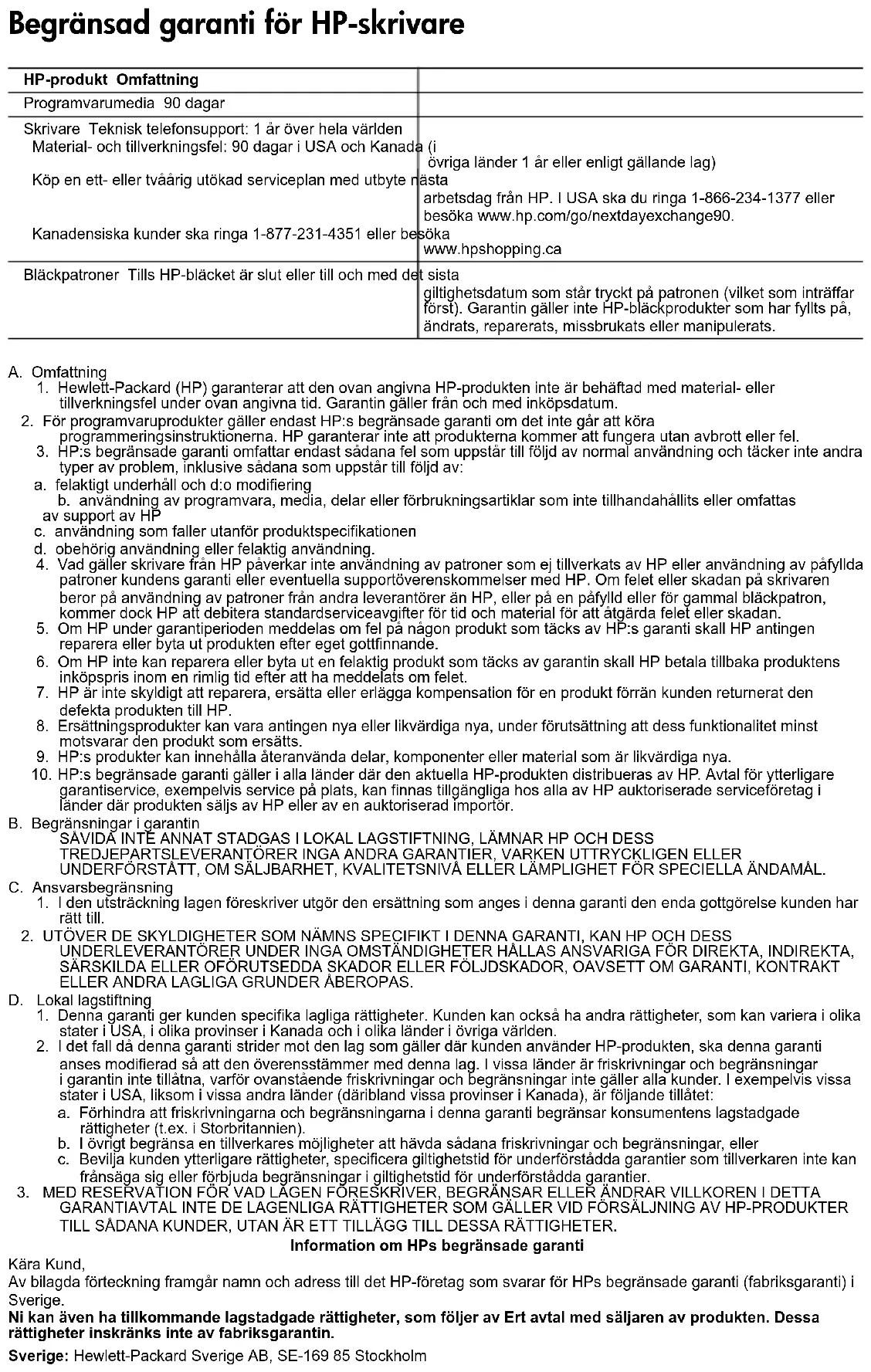 TÄSSÄ TAKUUILMOITUKSESSA ESITETYT TAKUUEHDOT EIVÄT SULJE POIS, RAJOITA TAI MUUTA ASIAKKAAN OIKEUKSIA, PAITSI LAIN SALLIMASSA LAAJUUDESSA, VAAN NIITÄ SOVELLETAAN NIIDEN PAKOLLISTEN LAKIMÄÄRÄISTEN OIKEUKSIEN LISÄKSI, JOTKA KOSKEVAT HP-TUOTTEEN MYYNTIÄ ASIAKKAALLE. HP:n takuu Hyvä asiakkaamme, oheisesta luettelosta löydätte yhteystiedot valmistajan takuusta vastaavaan HP:n edustajaan maassanne. Teillä voi olla oikeus esittää takuun lisäksi vaatimuksia myös lain nojalla. Valmistajan takuu ei rajoita lakiin perustuvia oikeuksianne. Suomi: Hewlett-Packard Oy, Piispankalliontie, FIN-02200 Espoo HP-tuote Rajoitettu takuuaika Ohjelmiston tallennusväline 90 päivää Tulostin Tekninen puhelintuki: 1 vuosi kaikkialla maailmassa Osat ja huolto: 90 päivää Yhdysvalloissa ja Kanadassa (Yhdysvaltain ja Kanadan ulkopuolella 1 vuosi tai paikallisen lainsäädännön edellyttämä aika) Hanki yhden tai kahden vuoden HP:n Next Business Day Exchange Extended Service Plan -palvelu. Jos asut Yhdysvalloissa, soita numeroon 1-866-234-1377 tai käy osoitteessa www.hp.com/go/nextdayexchange90. Jos asut Kanadassa,soita numeroon 1-877-231-4351 tai käy osoitteessa www.hpshopping.ca. Tulostus- tai mustekasetit Siihen asti, kunnes HP:n muste on kulunut loppuun tai kasettiin merkitty takuuajankohta on umpeutunut, aiempi näistä kahdesta. Tämä takuu ei kata HP-tuotteita, jotka on täytetty, valmistettu uudelleen, kunnostettu, joita on käytetty väärin tai joita on jollain tavalla muutettu. HP-tulostimen rajoitetun takuun lausekeSvart blekkpatronTrefargers blekkpatron