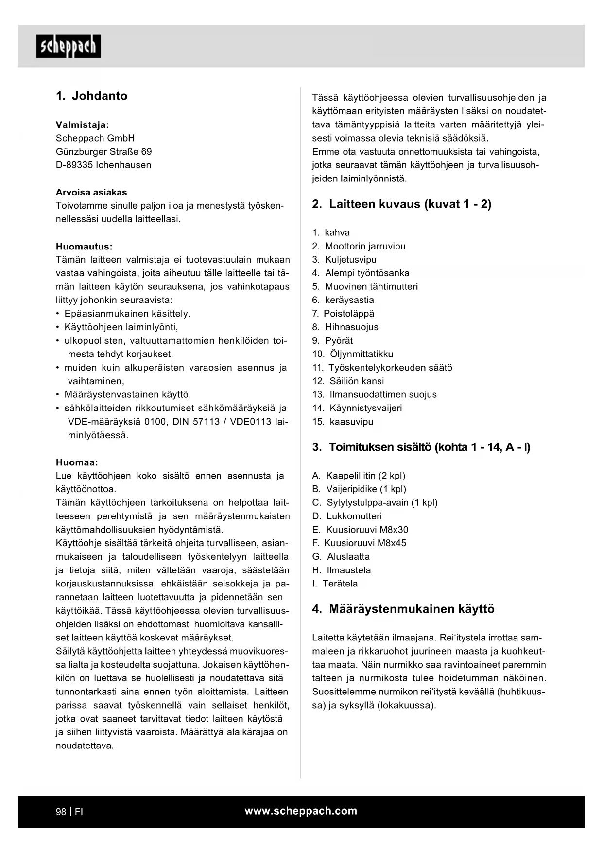 Valmistaja: Scheppach GmbH Günzburger Straße 69 D-89335 Ichenhausen Arvoisa asiakas Toivotamme sinulle paljon iloa ja menestystä työsken- nellessäsi uudella laitteellasi. Huomautus: Tämän laitteen valmistaja ei tuotevastuulain mukaan vastaa vahingoista, joita aiheutuu tälle laitteelle tai tä- män laitteen käytön seurauksena, jos vahinkotapaus liittyy johonkin seuraavista: