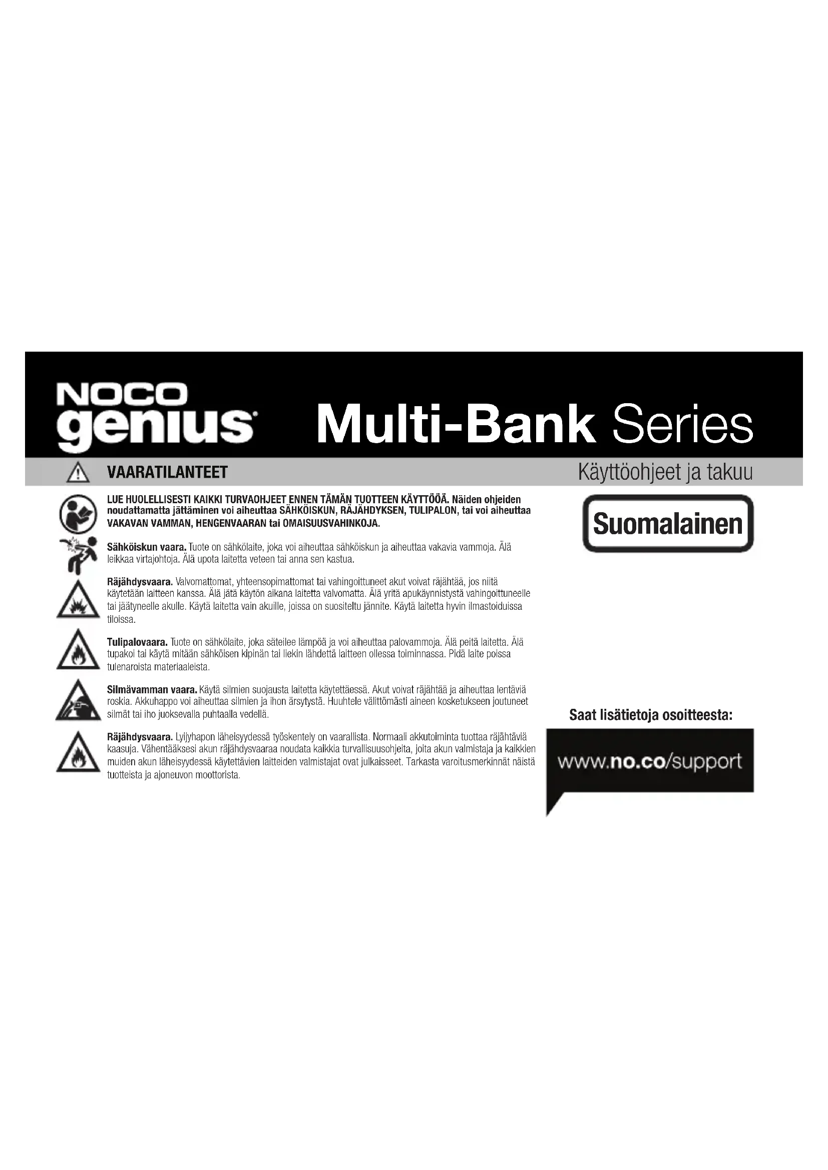 Disse betingelsene gjelder bare for produktet i løpet av garantiperioden. Den problemfrie garantien blir enten ugyldig etter forløpt tide fra kjøpsdatoen (forløpt tid fra serienummerdatoen, uten kjøpsbevis) eller fra betingelsene som er oppført tidligere i dette dokumentet. Returner produktet med passende dokumentasjon. Med kvittering: 0–3 år: INGEN belastning. Med kjøpsbevis starter garantiperioden på kjøpsdatoen. UTEN kvittering: 0–3 år: INGEN belastning. UTEN kjøpsbevis starter garantiperioden på serienummerdatoen. Vi anbefaler at du registrerer NOCO-produktet ditt for å laste opp kjøpsbevis og forlenge den eektive garantidatoen. Du kan registrere NOCO-produktet ditt på nettet på no.co/ register. Hvis du har spørsmål om garantien eller produktet, kan du kontakte NOCOs brukerstøtte (e-postadresse og telefonnummer ovenfor) eller skrive til: NOCO Company på 30339 Diamond Parkway, #102, Glenwillow, OH 44139 USA. NOKäyttöohjeet ja takuu VAARATILANTEET LUE HUOLELLISESTI KAIKKI TURVAOHJEET ENNEN TÄMÄN TUOTTEEN KÄYTTÖÖÄ. Näiden ohjeiden noudattamatta jättäminen voi aiheuttaa SÄHKÖISKUN, RÄJÄHDYKSEN, TULIPALON, tai voi aiheuttaa VAKAVAN VAMMAN, HENGENVAARAN tai OMAISUUSVAHINKOJA. Sähköiskun vaara. Tuote on sähkölaite, joka voi aiheuttaa sähköiskun ja aiheuttaa vakavia vammoja. Älä leikkaa virtajohtoja. Älä upota laitetta veteen tai anna sen kastua. Räjähdysvaara. Valvomattomat, yhteensopimattomat tai vahingoittuneet akut voivat räjähtää, jos niitä käytetään laitteen kanssa. Älä jätä käytön aikana laitetta valvomatta. Älä yritä apukäynnistystä vahingoittuneelle tai jäätyneelle akulle. Käytä laitetta vain akuille, joissa on suositeltu jännite. Käytä laitetta hyvin ilmastoiduissa tiloissa. Tulipalovaara. Tuote on sähkölaite, joka säteilee lämpöä ja voi aiheuttaa palovammoja. Älä peitä laitetta. Älä tupakoi tai käytä mitään sähköisen kipinän tai liekin lähdettä laitteen ollessa toiminnassa. Pidä laite poissa tulenaroista materiaaleista. Silmävamman vaara. Käytä silmien suojausta laitetta käytettäessä. Akut voivat räjähtää ja aiheuttaa lentäviä roskia. Akkuhappo voi aiheuttaa silmien ja ihon ärsytystä. Huuhtele välittömästi aineen kosketukseen joutuneet silmät tai iho juoksevalla puhtaalla vedellä. Räjähdysvaara. Lyijyhapon läheisyydessä työskentely on vaarallista. Normaali akkutoiminta tuottaa räjähtäviä kaasuja. Vähentääksesi akun räjähdysvaaraa noudata kaikkia turvallisuusohjeita, joita akun valmistaja ja kaikkien muiden akun läheisyydessä käytettävien laitteiden valmistajat ovat julkaisseet. Tarkasta varoitusmerkinnät näistä tuotteista ja ajoneuvon moottorista. Saat lisätietoja osoitteesta: Multi-Bank Series SuomalainenTietoja Genius Multi-Bank:stä. NOCO Genius Multi-Bank edustaa markkinoiden innovatiivisinta ja edistyneintä teknologiaa. Se tekee jokaisesta latauksesta helpon ja nopean. Se on todennäköisesti turvallisin ja tehokkain laturi, jota tulet koskaan käyttämään. Genius multi-bank -sarja on suunniteltu kaikentyyppisten 6V ja 12V lyijyhappoakkujen lataamiseen, mukaan lukien litium (LiFePO4) märkäakut (nesteakut), geeliakut, huoltovapaat (MF-akut), kalsiumakut, tehostetut märkäakut (EFB) ja absorboituneet lasimattoakut (AGM), sekä 12 V litiumakut (LiFePO4). Se soveltuu jopa 40 ampeeritunnin akkujen lataamiseen ja kaikenkokoisten akkujen huoltoon. Aloittaminen. Ennen laturin käyttämistä lue huolellisesti akun valmistajan erityiset varotoimet ja akun suositellun latausnopeuden tiedot. Varmista, että ennen latausta määrität akun jännitteen ja kemiallisen rakenteen tutustumalla akkuun liittyvään omistajan käsikirjaan. Kiinnitys. On tärkeää pitää mielessä etäisyys akkuun. DC- kaapelin pituus laturista joko akkupuristimella tai rengaspääteliittimillä on noin 86 cm. Jatkojohdon pituus on noin 3 metriä. Jätä noin 30 cm varaa kytkentöjen välille molemmissa kytkentätyypeissä. Esitys 65. Akut, päätteet ja niihin liittyvät lisävarusteet sisältävät kemikaaleja, myös lyijyä. Nämä materiaalit tiedetään aiheuttavan syöpää, sikiövaurioita ja muita lisääntymishäiriöitä. (Kalifornian osavaltio) Henkilökohtaiset varotoimet. Käytä laitetta vain käyttötarkoituksen mukaisesti. Toisen henkilön tulisi olla äänietäisyydellä tai riittävän lähellä saadaksesi avun hätätilanteessa. Pidä puhdasta vettä ja saippuaa lähellä akkuhapon saastuttamisen varalta. Käytä täydellistä silmien suojausta ja suojavaatteita, kun työskentelet akun lähellä. Pese kätesi aina akkujen ja niihin liittyvien materiaalien käsittelyn jälkeen. Älä käsittele tai käytä mitään metalliesineitä, kun työskentelet akkujen kanssa, kuten työkaluja, kelloja tai koruja. Jos metalli putoaa akkuun, se saattaa aiheuttaa kipinöitä tai aiheuttaa oikosulun ja tästä voi seurata sähköisku, tulipalo tai räjähdys, josta taas voi aiheutua loukkaantumista, hengenvaaraa tai omaisuusvahinkoja. Alaikäiset. Jos “ostaja” on tarkoittanut tuotteen alaikäisen käytettäväksi, hankintaikäinen aikuinen sitoutuu antamaan yksityiskohtaiset ohjeet ja varoitukset alaikäisille ennen käyttöä. Jos näin ei tehdä, käyttö on yksinomaan “Ostajan” vastuulla, joka sitoutuu korvaamaan NOCO:lle alaikäisen tahattoman tai tahallisen väärinkäytön. Tukehtumisvaara. Lisätarvikkeet voivat aiheuttaa lapsille tukehtumisvaaran. Älä jätä lapsia vartioimatta laitteen tai lisätarvikkeiden läheisyydessä. Laite ei ole lelu. Käsittely. Käsittele laitetta varoen. Laite voi vaurioitua, jos se joutuu alttiiksi iskuille. Älä käytä vaurioitunutta laitetta, jos siinä on esimerkiksi halkeamia kotelossa tai vahingoittuneita kaapeleita. Älä käytä laitetta, jossa virtajohto on vaurioitunut. Kosteus ja nesteet voivat vahingoittaa laitetta. Älä käsittele laitetta tai muita sähköisiä osia minkään nesteen läheisyydessä. S