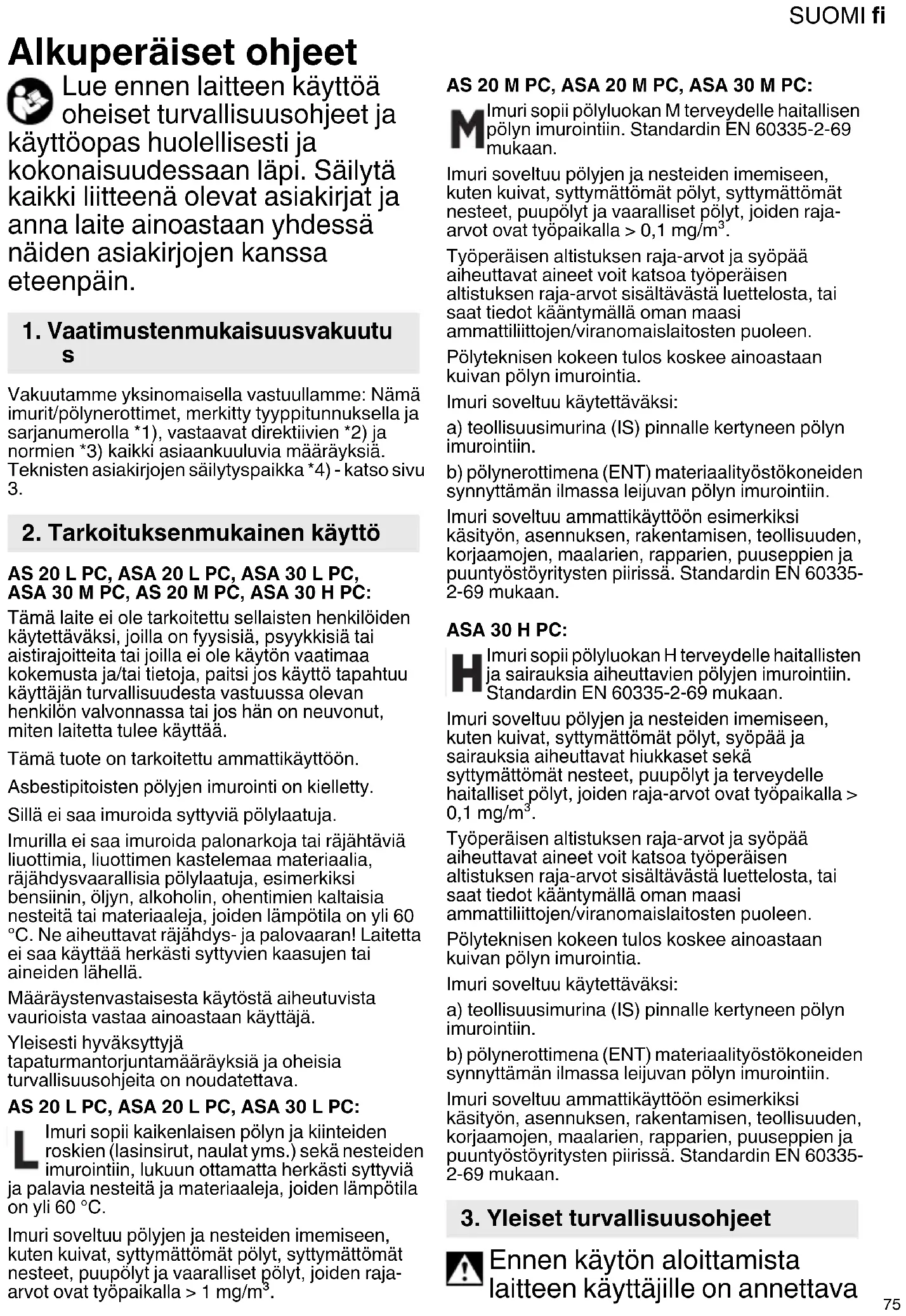 AS 20 L PC, ASA 20 L PC, ASA 30 L PC, ASA 30 M PC, AS 20 M PC, ASA 30 H PC: Tämä laite ei ole tarkoitettu sellaisten henkilöiden käytettäväksi, joilla on fyysisiä, psyykkisiä tai aistirajoitteita tai joilla ei ole käytön vaatimaa kokemusta ja/tai tietoja, paitsi jos käyttö tapahtuu käyttäjän turvallisuudesta vastuussa olevan henkilön valvonnassa tai jos hän on neuvonut, miten laitetta tulee käyttää. Tämä tuote on tarkoitettu ammattikäyttöön. Asbestipitoisten pölyjen imurointi on kielletty. Sillä ei saa imuroida syttyviä pölylaatuja. Imurilla ei saa imuroida palonarkoja tai räjähtäviä liuottimia, liuottimen kastelemaa materiaalia, räjähdysvaarallisia pölylaatuja, esimerkiksi bensiinin, öljyn, alkoholin, ohentimien kaltaisia nesteitä tai materiaaleja, joiden lämpötila on yli 60 °C. Ne aiheuttavat räjähdys- ja palovaaran! Laitetta ei saa käyttää herkästi syttyvien kaasujen tai aineiden lähellä. Määräystenvastaisesta käytöstä aiheutuvista vaurioista vastaa ainoastaan käyttäjä. Yleisesti hyväksyttyjä tapaturmantorjuntamääräyksiä ja oheisia turvallisuusohjeita on noudatettava. AS 20 L PC, ASA 20 L PC, ASA 30 L PC: Imuri sopii kaikenlaisen pölyn ja kiinteiden roskien (lasinsirut, naulat yms.) sekä nesteiden imurointiin, lukuun ottamatta herkästi syttyviä ja palavia nesteitä ja materiaaleja, joiden lämpötila on yli 60 °C. Imuri soveltuu pölyjen ja nesteiden imemiseen, kuten kuivat, syttymättömät pölyt, syttymättömät nesteet, puupölyt ja vaaralliset pölyt, joiden raja- arvot ovat työpaikalla > 1 mg/m³. AS 20 M PC, ASA 20 M PC, ASA 30 M PC: Imuri sopii pölyluokan M terveydelle haitallisen pölyn imurointiin. Standardin EN 60335-2-69 mukaan. Imuri soveltuu pölyjen ja nesteiden imemiseen, kuten kuivat, syttymättömät pölyt, syttymättömät nesteet, puupölyt ja vaaralliset pölyt, joiden raja- arvot ovat työpaikalla > 0,1 mg/m³. Työperäisen altistuksen raja-arvot ja syöpää aiheuttavat aineet voit katsoa työperäisen altistuksen raja-arvot sisältävästä luettelosta, tai saat tiedot kääntymällä oman maasi ammattiliittojen/viranomaislaitosten puoleen. Pölyteknisen kokeen tulos koskee ainoastaan kuivan pölyn imurointia. Imuri soveltuu käytettäväksi: a) teollisuusimurina (IS) pinnalle kertyneen pölyn imurointiin. b) pölynerottimena (ENT) materiaalityöstökoneiden synnyttämän ilmassa leijuvan pölyn imurointiin. Imuri soveltuu ammattikäyttöön esimerkiksi käsityön, asennuksen, rakentamisen, teollisuuden, korjaamojen, maalarien, rapparien, puuseppien ja puuntyöstöyritysten piirissä. Standardin EN 60335- 2-69 mukaan. ASA 30 H PC: Imuri sopii pölyluokan H terveydelle haitallisten ja sairauksia aiheuttavien pölyjen imurointiin. Standardin EN 60335-2-69 mukaan. Imuri soveltuu pölyjen ja nesteiden imemiseen, kuten kuivat, syttymättömät pölyt, syöpää ja sairauksia aiheuttavat hiukkaset sekä syttymättömät nesteet, puupölyt ja terveydelle haitalliset pölyt, joiden raja-arvot ovat työpaikalla > 0,1 mg/m³. Työperäisen altistuksen raja-arvot ja syöpää aiheuttavat aineet voit katsoa työperäisen altistuksen raja-arvot sisältävästä luettelosta, tai saat tiedot kääntymällä oman maasi ammattiliittojen/viranomaislaitosten puoleen. Pölyteknisen kokeen tulos koskee ainoastaan kuivan pölyn imurointia. Imuri soveltuu käytettäväksi: a) teollisuusimurina (IS) pinnalle kertyneen pölyn imurointiin. b) pölynerottimena (ENT) materiaalityöstökoneiden synnyttämän ilmassa leijuvan pölyn imurointiin. Imuri soveltuu ammattikäyttöön esimerkiksi käsityön, asennuksen, rakentamisen, teollisuuden, korjaamojen, maalarien, rapparien, puuseppien ja puuntyöstöyritysten piirissä. Standardin EN 60335- 2-69 mukaan. Ennen käytön aloittamista laitteen käyttäjille on annettava