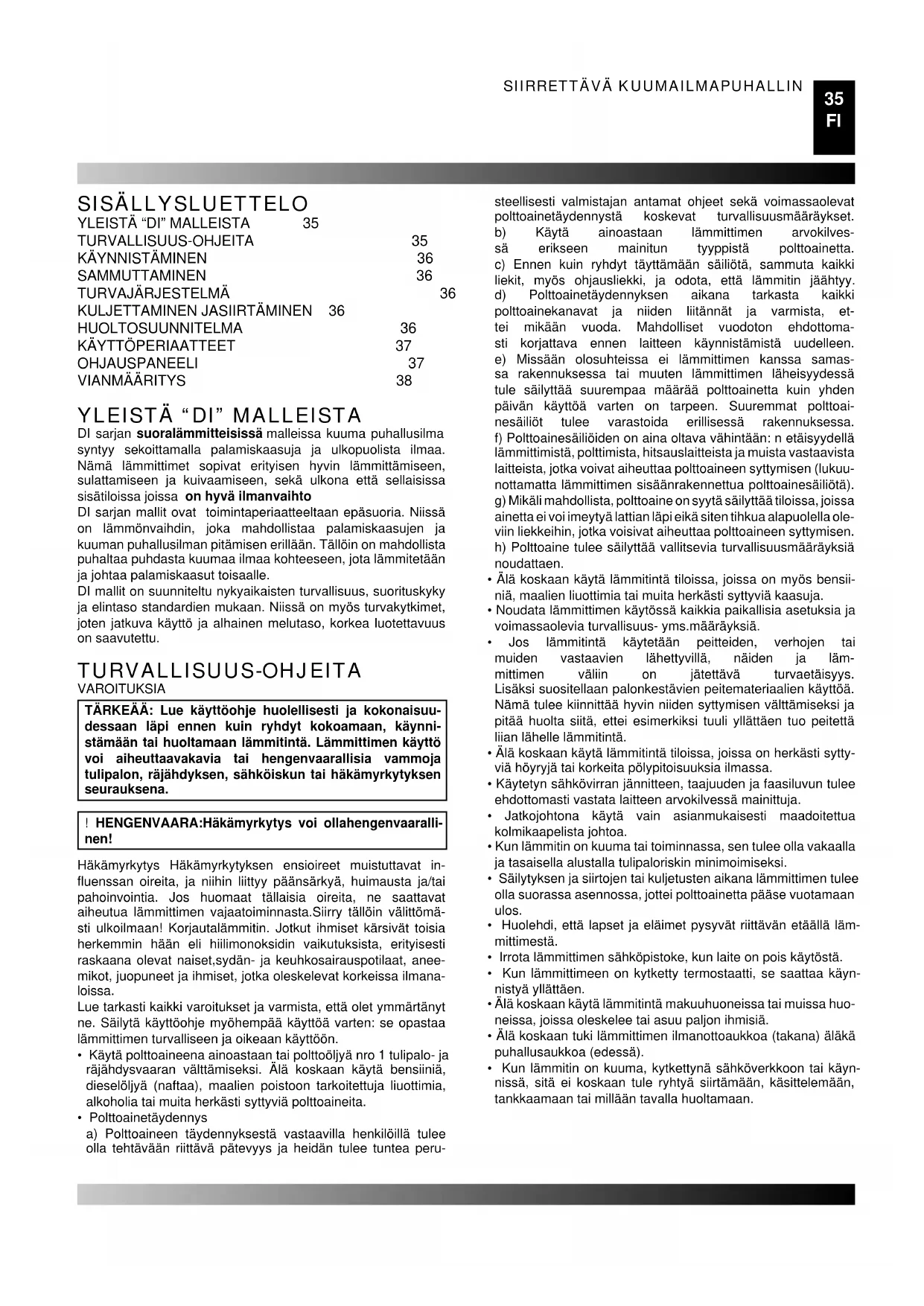 DI sarjan suoralämmitteisissä malleissa kuuma puhallusilma syntyy sekoittamalla palamiskaasuja ja ulkopuolista ilmaa. Nämä lämmittimet sopivat erityisen hyvin lämmittämiseen, sulattamiseen ja kuivaamiseen, sekä ulkona että sellaisissa sisätiloissa joissa on hyvä ilmanvaihto DI sarjan mallit ovat toimintaperiaatteeltaan epäsuoria. Niissä on lämmönvaihdin, joka mahdollistaa palamiskaasujen ja kuuman puhallusilman pitämisen erillään. Tällöin on mahdollista puhaltaa puhdasta kuumaa ilmaa kohteeseen, jota lämmitetään ja johtaa palamiskaasut toisaalle. DI mallit on suunniteltu nykyaikaisten turvallisuus, suorituskyky ja elintaso standardien mukaan. Niissä on myös turvakytkimet, joten jatkuva käyttö ja alhainen melutaso, korkea luotettavuus on saavutettu. TURVALLISUUS-OHJEITA VAROITUKSIA TÄRKEÄÄ: Lue käyttöohje huolellisesti ja kokonaisuu- dessaan läpi ennen kuin ryhdyt kokoamaan, käynni- stämään tai huoltamaan lämmitintä. Lämmittimen käyttö voi aiheuttaavakavia tai hengenvaarallisia vammoja tulipalon, räjähdyksen, sähköiskun tai häkämyrkytyksen seurauksena. ! HENGENVAARA:Häkämyrkytys voi ollahengenvaaralli- nen! Häkämyrkytys Häkämyrkytyksen ensioireet muistuttavat in- fl uenssan oireita, ja niihin liittyy päänsärkyä, huimausta ja/tai pahoinvointia. Jos huomaat tällaisia oireita, ne saattavat aiheutua lämmittimen vajaatoiminnasta.Siirry tällöin välittömä- sti ulkoilmaan! Korjautalämmitin. Jotkut ihmiset kärsivät toisia herkemmin hään eli hiilimonoksidin vaikutuksista, erityisesti raskaana olevat naiset,sydän- ja keuhkosairauspotilaat, anee- mikot, juopuneet ja ihmiset, jotka oleskelevat korkeissa ilmana- loissa. Lue tarkasti kaikki varoitukset ja varmista, että olet ymmärtänyt ne. Säilytä käyttöohje myöhempää käyttöä varten: se opastaa lämmittimen turvalliseen ja oikeaan käyttöön.