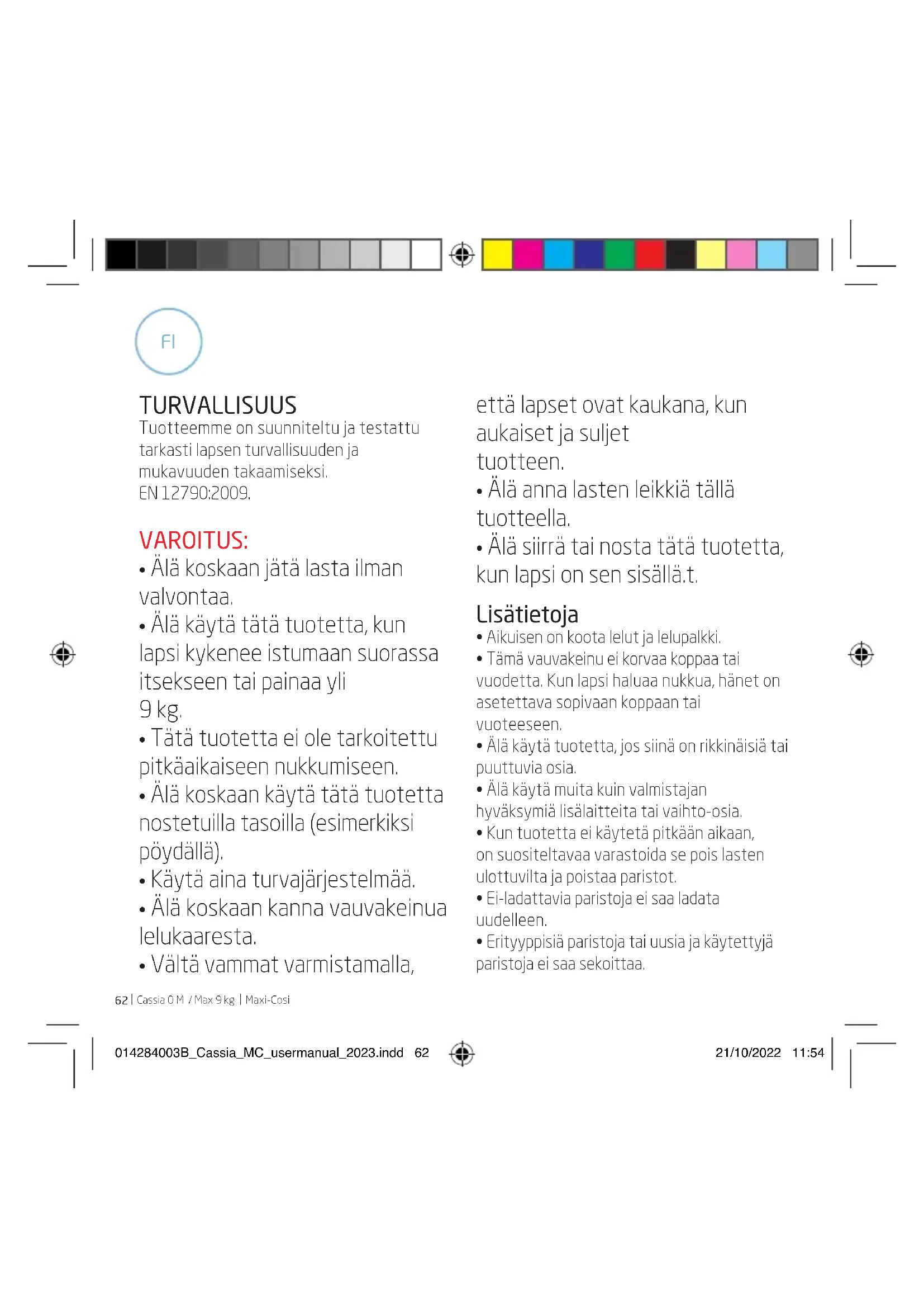 Maxi-Cosi TURVALLISUUS Tuotteemme on suunniteltu ja testattu tarkasti lapsen turvallisuuden ja mukavuuden takaamiseksi. EN 12790:2009. VAROITUS: