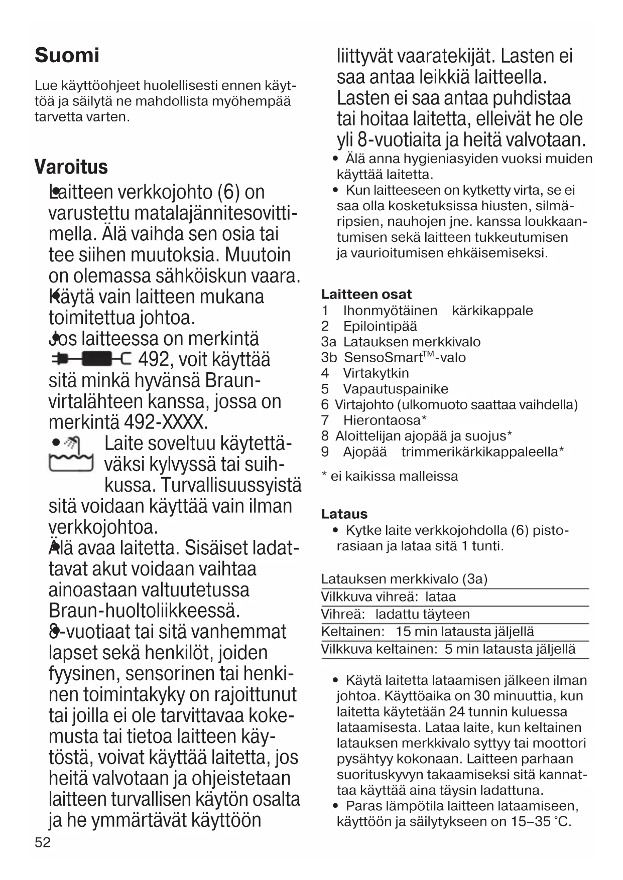 - Ohuet ihokarvat eivät välttämättä pääse kasvamaan ihon pinnalle asti. Kuorinta auttaa estämään ihokarvojen kasvun sisäänpäin hankaamalla/poistamalla pinnallista ihosolukkoa, jotta hennot ihokarvat pääsevät ihon pinnan läpi. Epilointipään puhdistus Säännöllinen epilointipään puhdistus var- mistaa hyvän hygienian. Irrota ensin käy- tetty kärkiosa (1, 7 tai 8) ja huuhtele se juoksevalla vedellä. Irrota epilointipää pai- namalla vapautuspainiketta (5). Kuiva-ajo: Puhdista pinsettiosa perusteel- lisesti puhdistusharjalla. Märkäajo: Huuhtele epilointipää juoksevalla vedellä jokaisen märkäkäytön (erityisesti geelin kanssa) jälkeen. Käynnistä epilaat- tori muutamaksi sekunniksi puhdistuksen aikana. Kiinnitä yksi kärkikappaleista pai- kalleen vasta sitten, kun epilointipää on täysin kuiva. Yleistä tietoa epiloinnista Kaikki ihokarvanpoistomenetelmät, joissa karvat poistetaan juuresta, voivat aiheuttaa ihokarvojen kasvua sisäänpäin tai ihoärsy- tystä (esim. ihon kutinaa, epämukavuutta tai punoitusta) ihon ja ihokarvojen kunnosta riippuen. Kyseessä on normaali reaktio, joka häviää yleensä nopeasti. Reaktio voi kuitenkin olla voimakkaampi, kun ihokar- voja poistetaan juuresta ensimmäisiä ker- toja tai jos sinulla on herkkä iho. Jos iho on ärtynyt vielä 36 tunnin kuluttua, suosit- telemme kääntymistä lääkärin puoleen. Yleensä ihoreaktiot ja kivun tunne vähene- vät huomattavasti, kun Silk·épil-laitetta käytetään toistuvasti. Joissakin tapauk- sissa ihon sisään pääsevät bakteerit (esimerkiksi kun laitetta liikutellaan iholla) saattavat aiheuttaa tulehduksen. Epilointi- pään perusteellinen puhdistus ennen jokaista käyttökertaa vähentää tulehdus- riskiä. Jos et ole varma laitteen soveltuvuudesta itsellesi, ota yhteyttä lääkäriin. Seuraavissa tapauksissa laitetta tulisi käyttää vasta, kun asiasta on keskusteltu lääkärin kanssa: ihottuma, haavat, tulehtunut iho, kuten karvan juuritupen tulehdus (märkivät karvatupet), suonikohjut, luomien ympärillä, ihon heikentynyt vastustuskyky, syynä esim. diabetes, raskausaika, Raynaud’n oireyhtymä, verenvuototauti, immuu- nipuutos tai hiivatulehdus. Ihokarvojen ajo (katso kuvaosio B) Ajopää (9) on suunniteltu säärien, kaina- loiden ja bikinirajan nopeaan ja tarkkaan ajamiseen, rajaukseen ja ihokarvojen leikkaamiseen 5 mm:n pituisiksi. Käytä ajopääosaa ainoastaan kuivalla iholla ja nopeusasetuksella II. a Ajaminen: valitse « ». b Rajaus: valitse « ». c Ihokarvojen ajaminen 5 mm:n pitui- siksi: valitse « » ja aseta viimeistelijän kärkikappale paikalleen (I). d Puhdistaminen: Älä puhdista terä- verkkoa (II) harjalla, koska se saattaa vahingoittaa teräsverkkoa. e Ajo-osat tulee voidella säännöllisesti 3 kuukauden välein. f Vaihda teräverkko (II) ja leikkuri (III), kun huomaat ajotuloksen heikentyvän.55 Varaosia saa jälleenmyyjältä, Braun huoltoliikkeistä tai osoitteesta www. service.braun.com. Älä käytä vaurioitu- nutta teräverkkoa. Ympäristöseikkoihin liittyviä tietoja Tämä laite sisältää akun ja kierrätet- täviä elektronisia osia. Ympäristö- suojelullisista syistä tuotetta ei saa hävittää kotitalousjätteen mukana. Hävitä tuote viemällä se asianmukaiseen keräyspisteeseen. Tiedot voivat muuttua ilman ennakkoilmoi- tusta. Takuu Tälle tuotteelle myönnämme 2 vuoden takuun ostopäivästä lukien Suomessa voimassa olevien alan takuuehtojen TE90 mukaan. Takuuaikana korvataan veloituk- setta kaikki viat, jotka aiheutuvat materi- aaliviasta tai valmistusvirheestä. Korvaus tapahtuu harkintamme mukaan korjaa- malla, vaihtamalla viallinen osa tai vaihta- malla koko laite uuteen. Takuu on voi- massa kaikkialla maailmassa sillä edellytyksellä, että laitetta myydään ko. maassa Braunin tai virallisen maahan- tuojan toimesta. Takuun piiriin eivät kuulu viat, jotka johtu- vat virheellisestä käytöstä, normaalista kulumisesta tai joilla on vähäinen merkitys laitteen arvoon tai toimintaan. Takuun voi- massaolo lakkaa, jos laitetta korjataan muualla kuin valtuutetussa Braun-huolto- liikkeessä tai jos laitteessa käytetään muita kuin alkuperäisiä varaosia. Yksilöity ostokuitti riittää takuun voimassaolon osoittamiseksi: www.service.braun.com. Lisätietoa takuuseen liittyvistä asioista saa asiakaspalvelukeskuksestamme numerosta 020-377 877.56 Polski Przed użyciem urządzenia przeczytaj dokładnie instrukcje użytkowania i zacho- waj ją do późniejszego wykorzystania. Ostrzeżenie