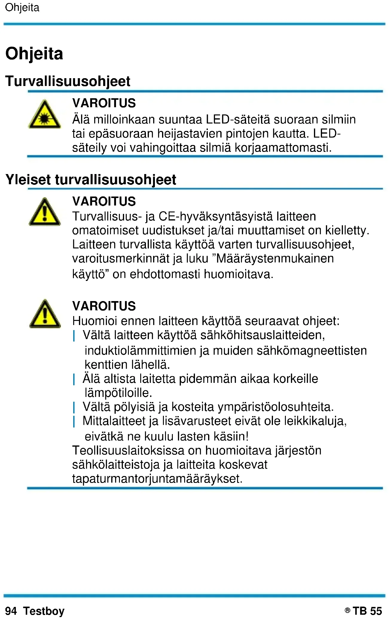 VAROITUS Turvallisuus- ja CE-hyväksyntäsyistä laitteen omatoimiset uudistukset ja/tai muuttamiset on kielletty. Laitteen turvallista käyttöä varten turvallisuusohjeet, varoitusmerkinnät ja luku ”Määräystenmukainen käyttö” on ehdottomasti huomioitava. VAROITUS Huomioi ennen laitteen käyttöä seuraavat ohjeet: | Vältä laitteen käyttöä sähköhitsauslaitteiden, induktiolämmittimien ja muiden sähkömagneettisten kenttien lähellä. | Älä altista laitetta pidemmän aikaa korkeille lämpötiloille. | Vältä pölyisiä ja kosteita ympäristöolosuhteita. | Mittalaitteet ja lisävarusteet eivät ole leikkikaluja, eivätkä ne kuulu lasten käsiin! Teollisuuslaitoksissa on huomioitava järjestön sähkölaitteistoja ja laitteita koskevat tapaturmantorjuntamääräykset.Ohjeita Testboy