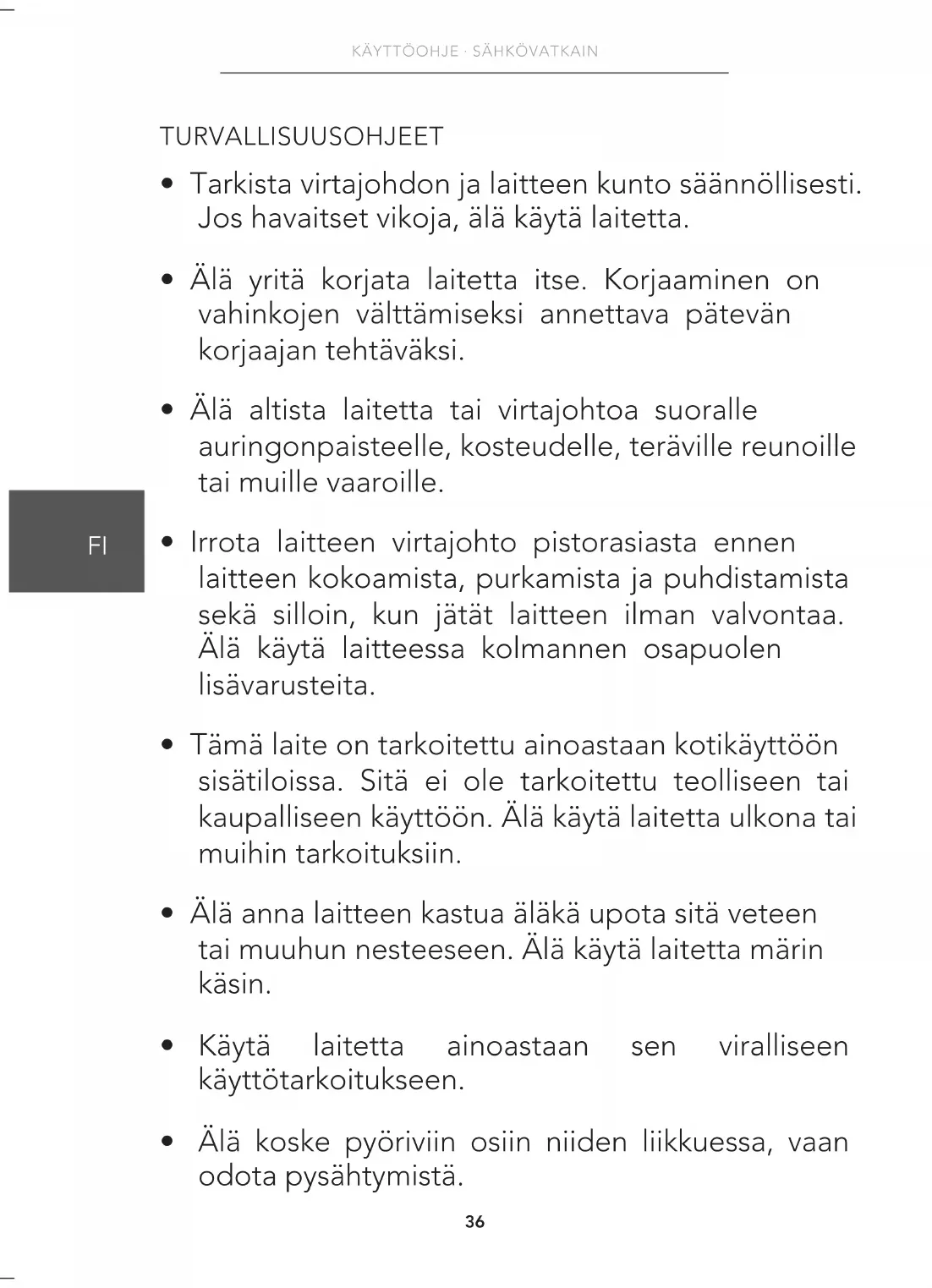 - Tarkista virtajohdon ja laitteen kunto säännöllisesti. Jos havaitset vikoja, älä käytä laitetta.