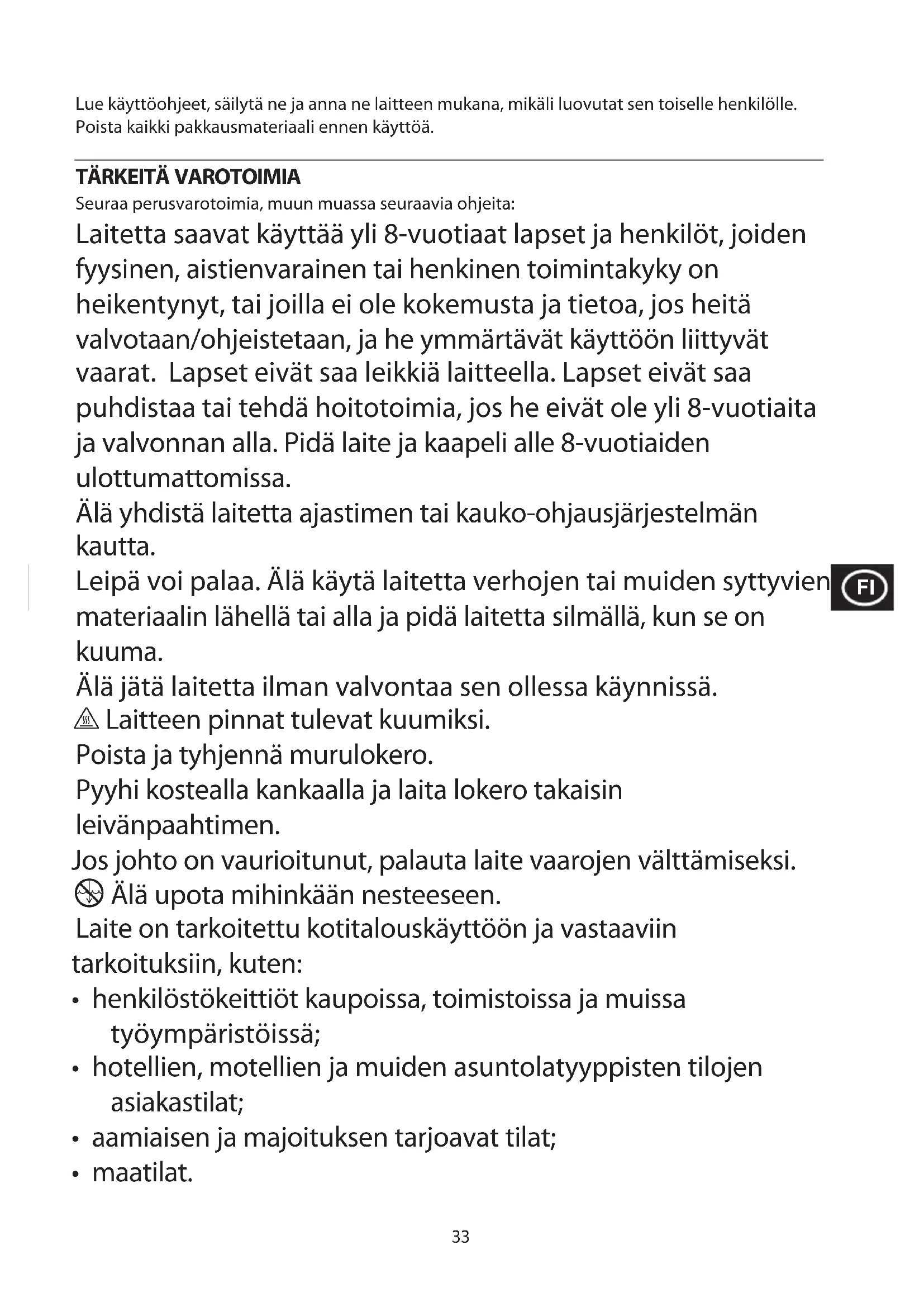Seuraa perusvarotoimia, muun muassa seuraavia ohjeita: Laitetta saavat käyttää yli 8-vuotiaat lapset ja henkilöt, joiden fyysinen, aistienvarainen tai henkinen toimintakyky on heikentynyt, tai joilla ei ole kokemusta ja tietoa, jos heitä valvotaan/ohjeistetaan, ja he ymmärtävät käyttöön liittyvät vaarat. Lapset eivät saa leikkiä laitteella. Lapset eivät saa puhdistaa tai tehdä hoitotoimia, jos he eivät ole yli 8-vuotiaita ja valvonnan alla. Pidä laite ja kaapeli alle 8-vuotiaiden ulottumattomissa. Älä yhdistä laitetta ajastimen tai kauko-ohjausjärjestelmän kautta. Leipä voi palaa. Älä käytä laitetta verhojen tai muiden syttyvien materiaalin lähellä tai alla ja pidä laitetta silmällä, kun se on kuuma. Älä jätä laitetta ilman valvontaa sen ollessa käynnissä. h Laitteen pinnat tulevat kuumiksi. Poista ja tyhjennä murulokero. Pyyhi kostealla kankaalla ja laita lokero takaisin leivänpaahtimen. Jos johto on vaurioitunut, palauta laite vaarojen välttämiseksi. i Älä upota mihinkään nesteeseen. Laite on tarkoitettu kotitalouskäyttöön ja vastaaviin tarkoituksiin, kuten: