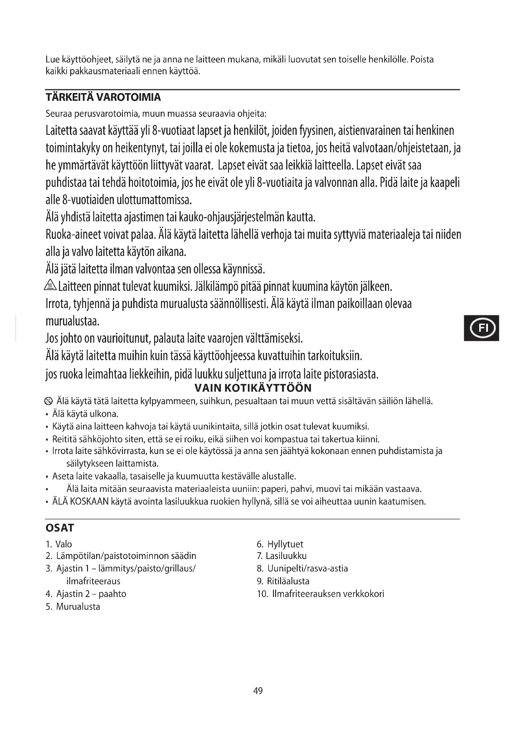 Seuraa perusvarotoimia, muun muassa seuraavia ohjeita: Laitetta saavat käyttää yli 8-vuotiaat lapset ja henkilöt, joiden fyysinen, aistienvarainen tai henkinen toimintakyky on heikentynyt, tai joilla ei ole kokemusta ja tietoa, jos heitä valvotaan/ohjeistetaan, ja he ymmärtävät käyttöön liittyvät vaarat. Lapset eivät saa leikkiä laitteella. Lapset eivät saa puhdistaa tai tehdä hoitotoimia, jos he eivät ole yli 8-vuotiaita ja valvonnan alla. Pidä laite ja kaapeli alle 8-vuotiaiden ulottumattomissa. Älä yhdistä laitetta ajastimen tai kauko-ohjausjärjestelmän kautta. Ruoka-aineet voivat palaa. Älä käytä laitetta lähellä verhoja tai muita syttyviä materiaaleja tai niiden alla ja valvo laitetta käytön aikana. Älä jätä laitetta ilman valvontaa sen ollessa käynnissä.