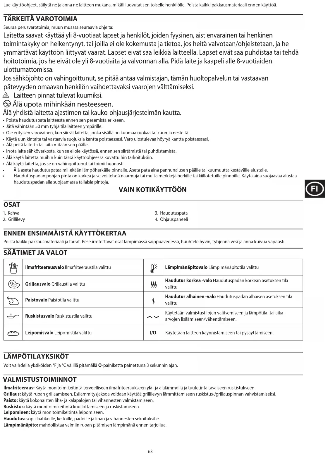 Laitteen pinnat tulevat kuumiksi. i Älä upota mihinkään nesteeseen. Älä yhdistä laitetta ajastimen tai kauko-ohjausjärjestelmän kautta.
