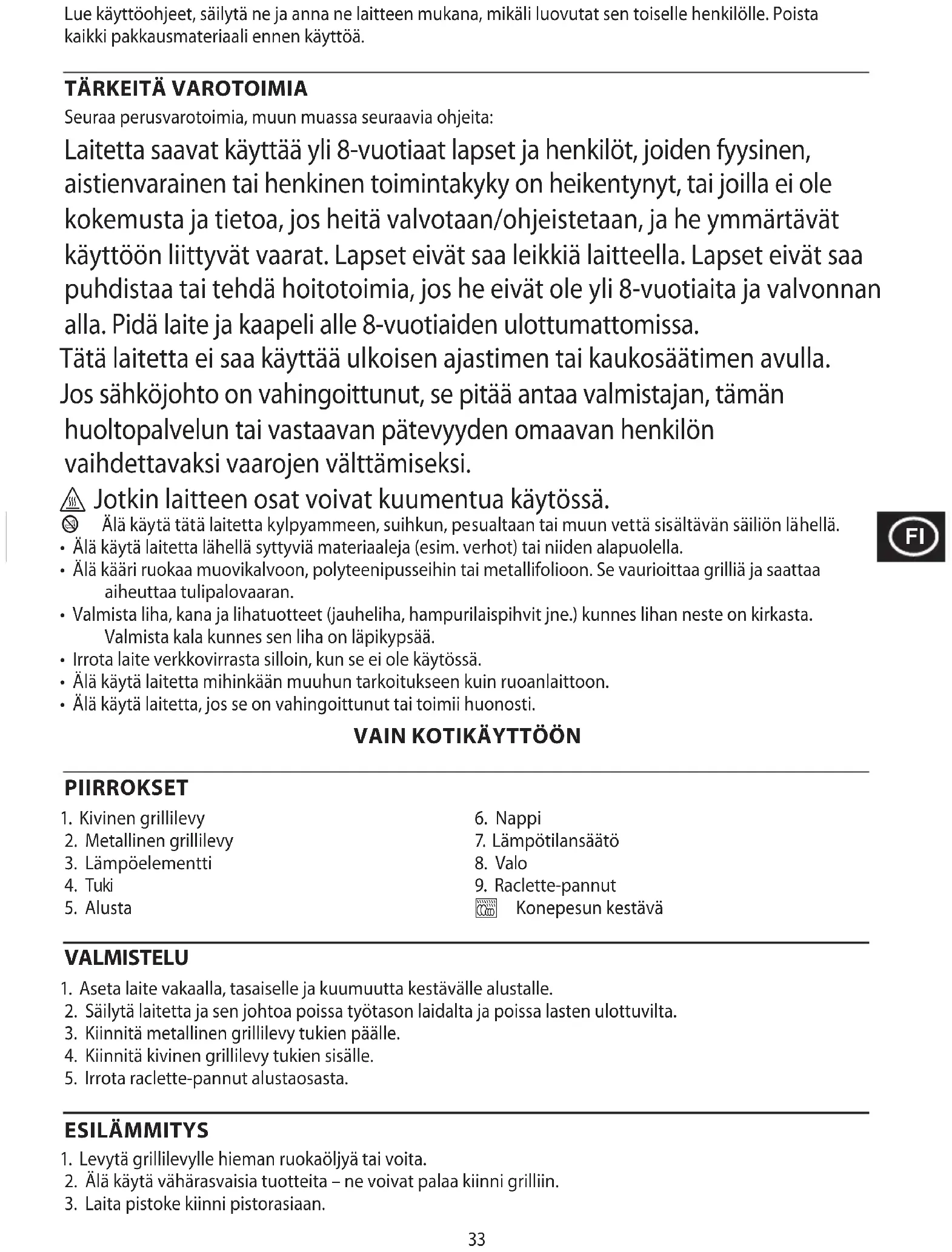 Seuraa perusvarotoimia, muun muassa seuraavia ohjeita: Laitetta saavat käyttää yli 8-vuotiaat lapset ja henkilöt, joiden fyysinen, aistienvarainen tai henkinen toimintakyky on heikentynyt, tai joilla ei ole kokemusta ja tietoa, jos heitä valvotaan/ohjeistetaan, ja he ymmärtävät käyttöön liittyvät vaarat. Lapset eivät saa leikkiä laitteella. Lapset eivät saa puhdistaa tai tehdä hoitotoimia, jos he eivät ole yli 8-vuotiaita ja valvonnan alla. Pidä laite ja kaapeli alle 8-vuotiaiden ulottumattomissa. Tätä laitetta ei saa käyttää ulkoisen ajastimen tai kaukosäätimen avulla. Jos sähköjohto on vahingoittunut, se pitää antaa valmistajan, tämän huoltopalvelun tai vastaavan pätevyyden omaavan henkilön vaihdettavaksi vaarojen välttämiseksi.
