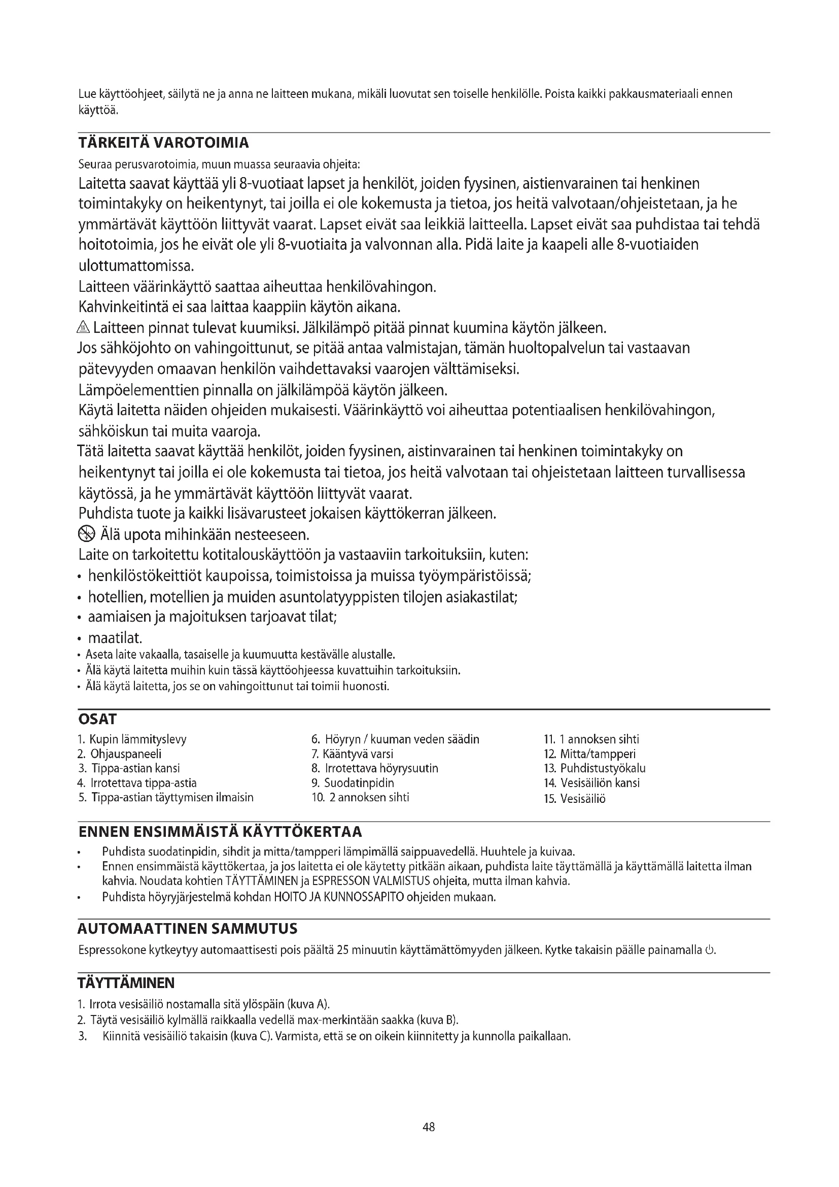 Seuraa perusvarotoimia, muun muassa seuraavia ohjeita: Laitetta saavat käyttää yli 8-vuotiaat lapset ja henkilöt, joiden fyysinen, aistienvarainen tai henkinen toimintakyky on heikentynyt, tai joilla ei ole kokemusta ja tietoa, jos heitä valvotaan/ohjeistetaan, ja he ymmärtävät käyttöön liittyvät vaarat. Lapset eivät saa leikkiä laitteella. Lapset eivät saa puhdistaa tai tehdä hoitotoimia, jos he eivät ole yli 8-vuotiaita ja valvonnan alla. Pidä laite ja kaapeli alle 8-vuotiaiden ulottumattomissa. Laitteen väärinkäyttö saattaa aiheuttaa henkilövahingon. Kahvinkeitintä ei saa laittaa kaappiin käytön aikana. h Laitteen pinnat tulevat kuumiksi. Jälkilämpö pitää pinnat kuumina käytön jälkeen. Jos sähköjohto on vahingoittunut, se pitää antaa valmistajan, tämän huoltopalvelun tai vastaavan pätevyyden omaavan henkilön vaihdettavaksi vaarojen välttämiseksi. Lämpöelementtien pinnalla on jälkilämpöä käytön jälkeen. Käytä laitetta näiden ohjeiden mukaisesti. Väärinkäyttö voi aiheuttaa potentiaalisen henkilövahingon, sähköiskun tai muita vaaroja. Tätä laitetta saavat käyttää henkilöt, joiden fyysinen, aistinvarainen tai henkinen toimintakyky on heikentynyt tai joilla ei ole kokemusta tai tietoa, jos heitä valvotaan tai ohjeistetaan laitteen turvallisessa käytössä, ja he ymmärtävät käyttöön liittyvät vaarat. Puhdista tuote ja kaikki lisävarusteet jokaisen käyttökerran jälkeen.